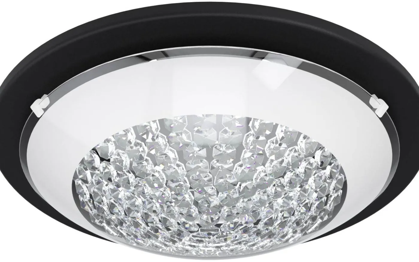 Den runda ACOLLA 1 LED-taklampan har en svart metallkropp med en böjd glaskåpa. Glaskåpan har en matt vit beläggning men lämnas klar i mitten så att de gnistrande dekorativa kristallerna inuti kan synas igenom bakom glaset. De integrerade lysdioderna ger ett behagligt, varmvitt ljus. Den eleganta kombinationen av svart och kristall ger en touch av stil till ditt hem och låter de glittrande elementen komma till sin rätt.