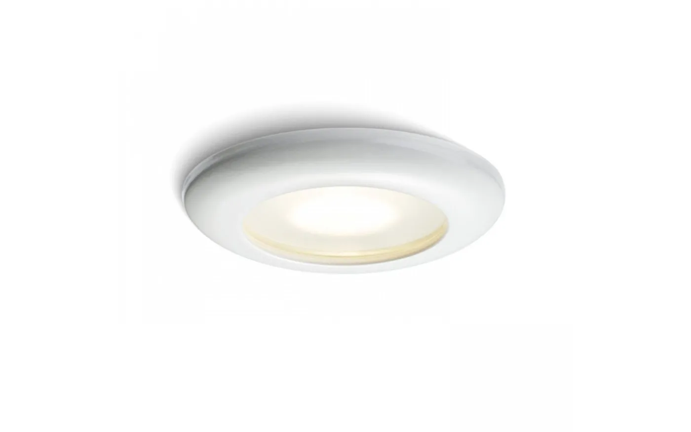 Infälld lampa för våtutrymmen med en täckskiva av satinerat glas. Transformator tillkommer.