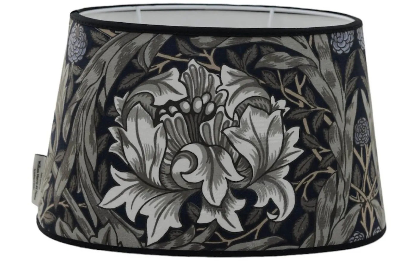 Den ovala lampskärmen Africa Marigold Velvet Cornflower är klädd i sammet med William Morris välkända Marigold-motiv. Den mörka färgskalan i grått och svart ger en sofistikerad atmosfär, medan sammetstyget tillför djup och liv åt mönstret.