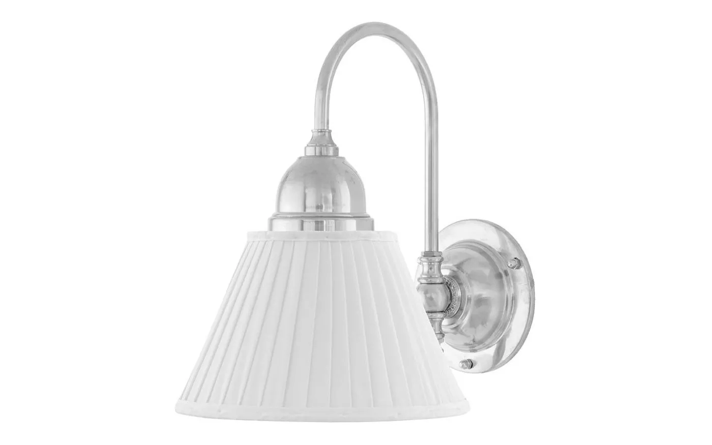 Klassisk väggarmatur för en öppen glasskärm eller alternativt textilskärm. Främst avsedd som allmän- eller stämningsbelysning i exempelvis en korridor eller sittande på var sin sida om en spegel eller tavla. Det nedre stagen kan avlägsnas om man vill montera lampan ovanför exemeplvis en spegel. För fast montage. För att gå in med kuloledning kompletteras med en distansplatta.