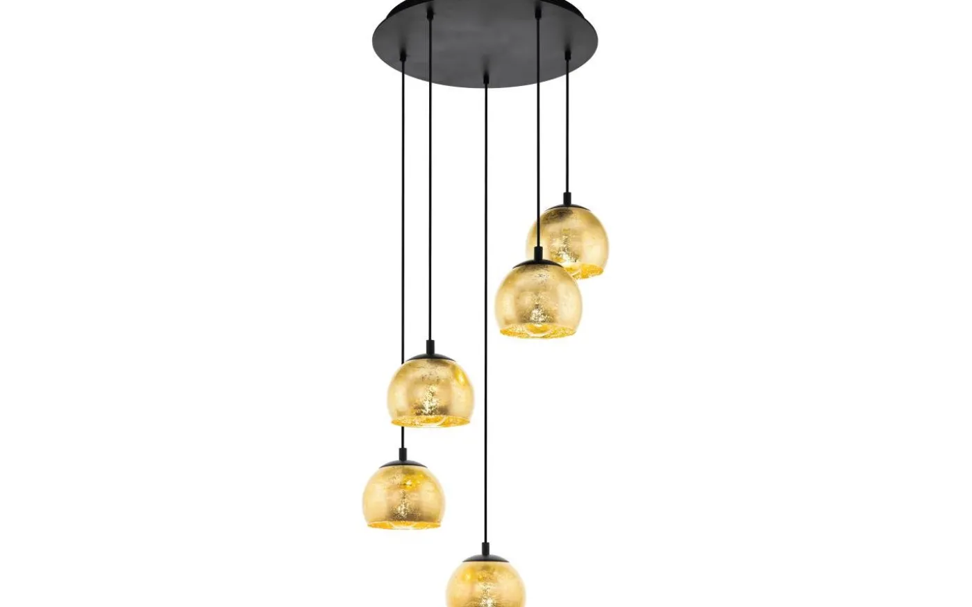 ALBARACCIN taklampa har fem sfäriska glasskärmar med en bladguld finish. Skärmarna är upphängda i en rund svart metallkapell på svarta textilkablar i ett elegant spiralarrangemang. Denna design ger en enastående finish till moderna interiörer och ger stilfull belysning i vardagsrummet eller ovanför bordet i matsalen.