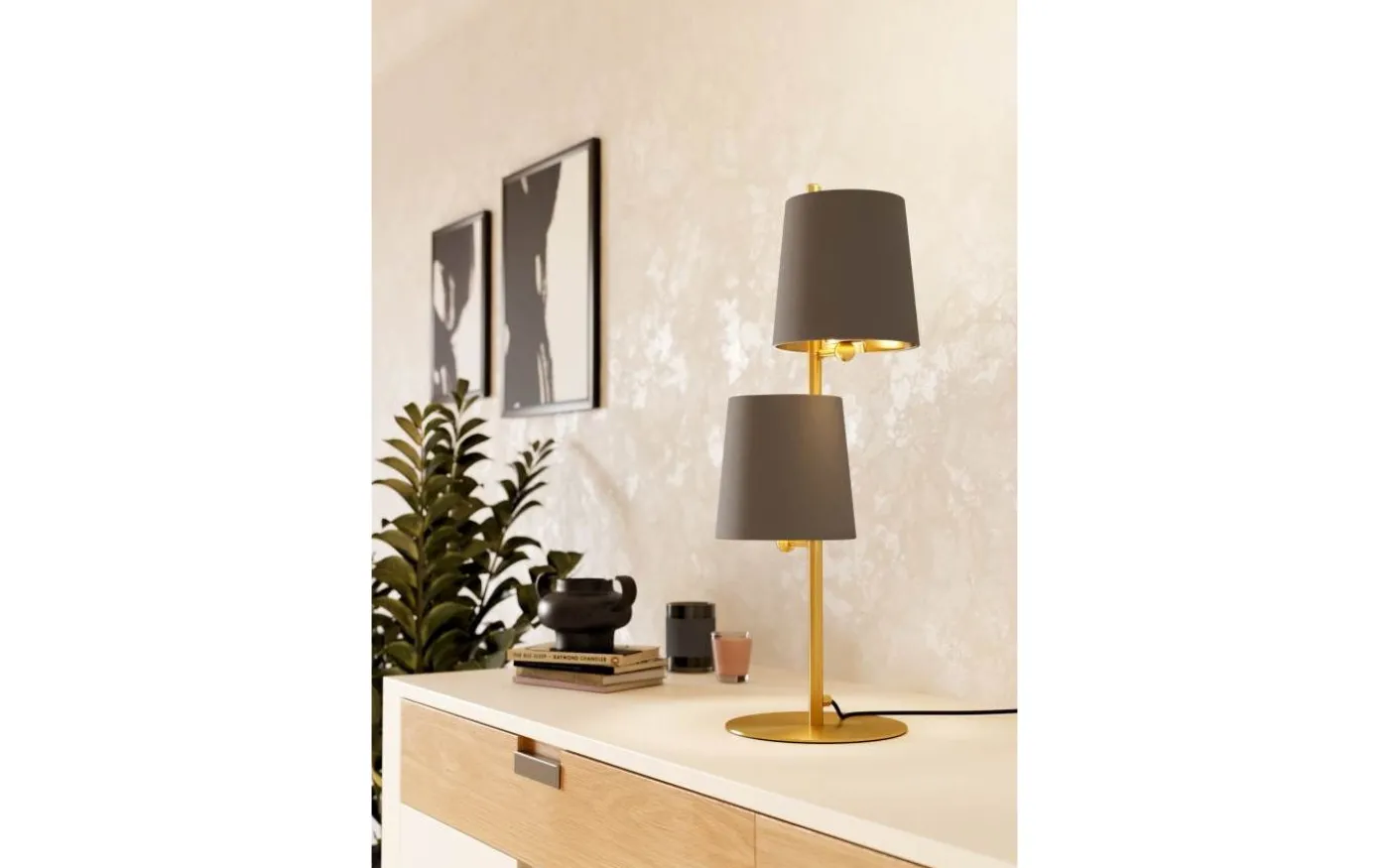 Bordslampan ALMEIDA 2 har en metallfot i borstad mässing, försedd med två koniska tygskärmar i cappuccino. Med en inre finish i borstad mässing skapar nyanserna ett attraktivt utseende. Lampan kan enkelt tändas och släckas med sladdströmbrytaren. Bordslampan har en retro-chic look i 60-talsstil och smälter sömlöst in i moderna interiörer och ger mysig belysning i sovrummet, vardagsrummet, matsalen eller hallen.