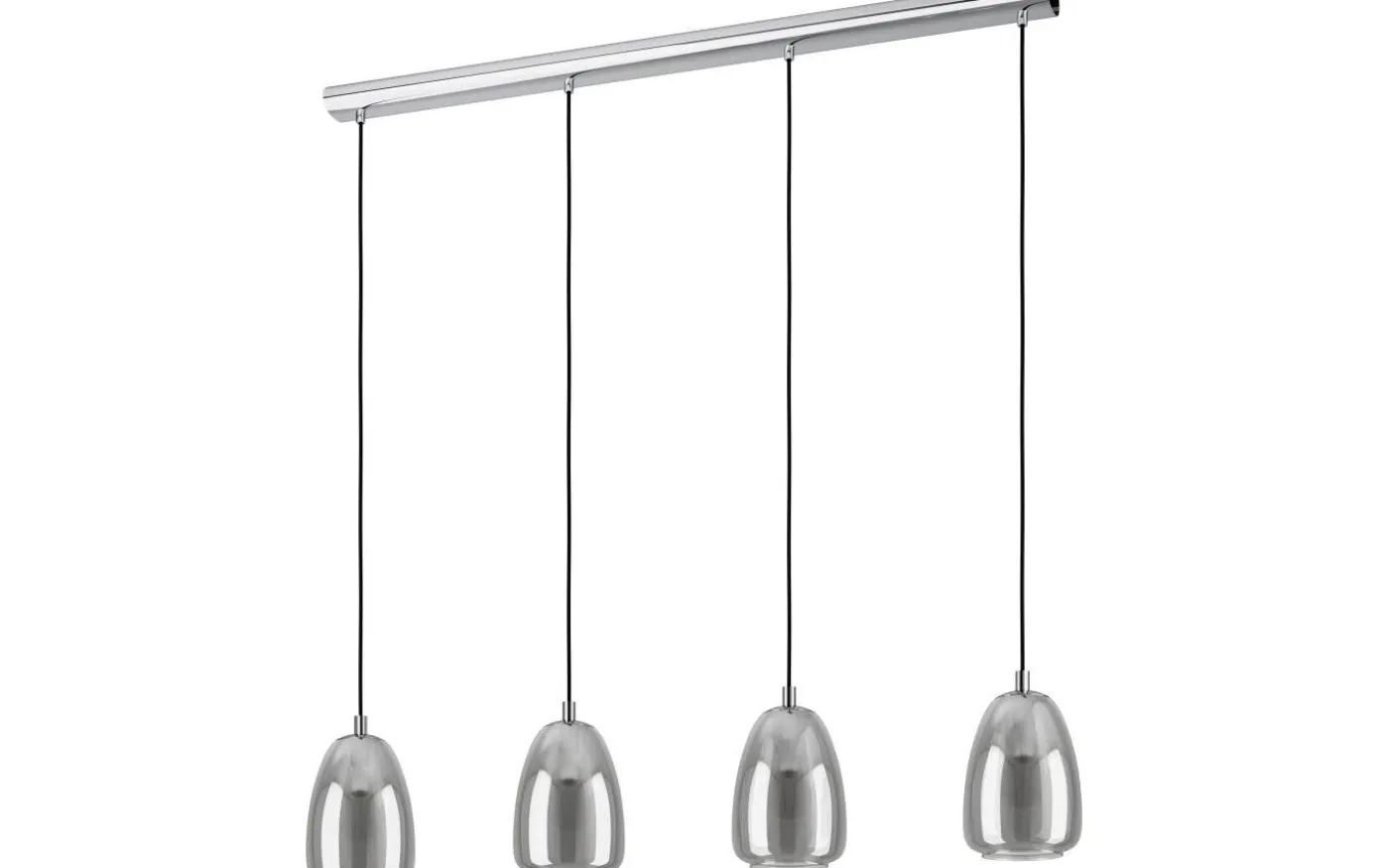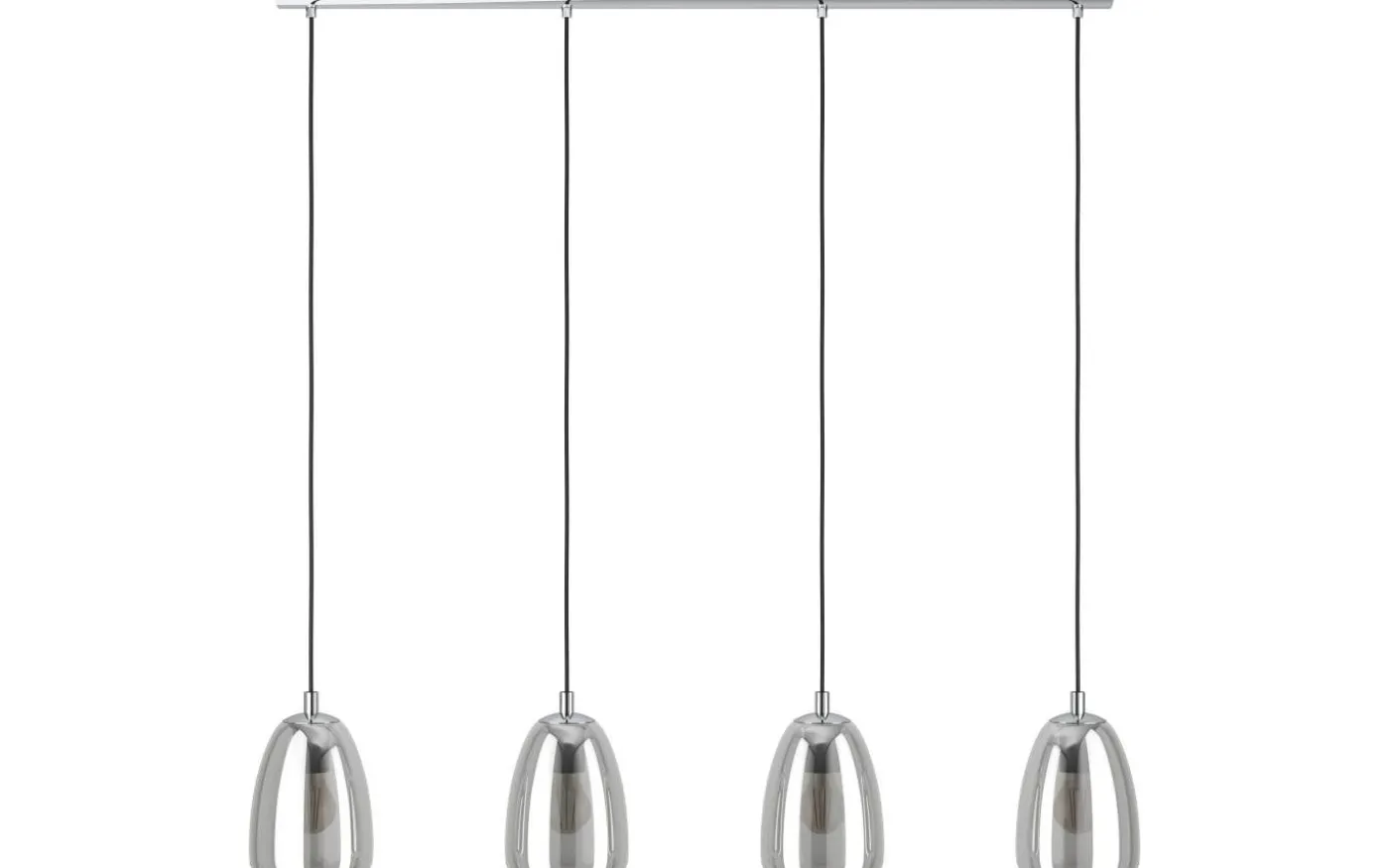 ALOBRASE taklampa har fyra rundade, rökta svarta glasskärmar som är upphängda i svarta kablar från en långsträckt kromfärgad metalltak. Dess design smälter in i nästan alla moderna interiörer. Den trendiga taklampan ger stilfull belysning för ditt utrymme, oavsett om det är i vardagsrummet eller ovanför bordet i matsalen.