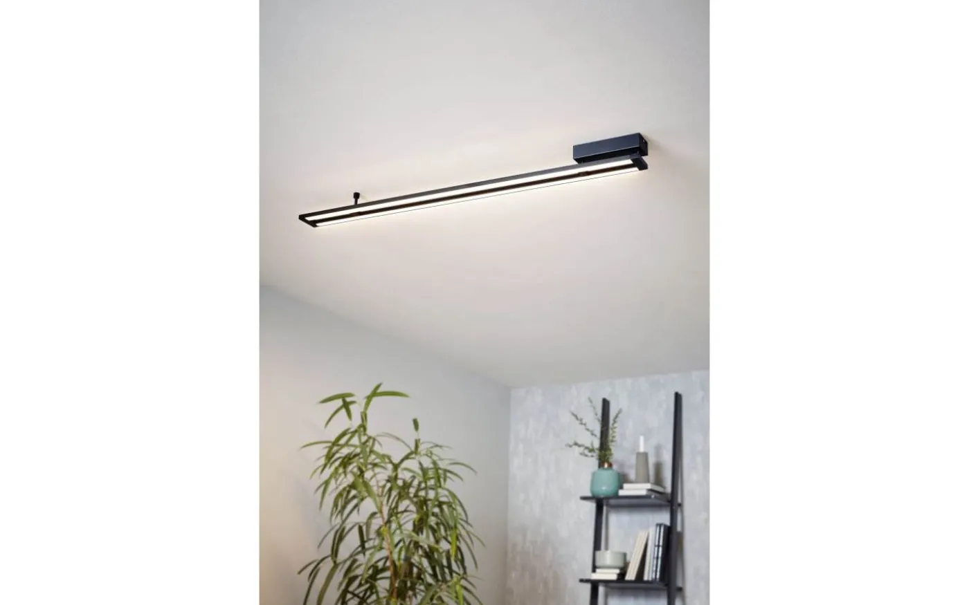 AMONTILLADO LED-taklampan har en linjär metallstomme i svart med två vita plastljuspaneler som löper parallellt med varandra. De integrerade lysdioderna ger ett behagligt varmvitt ljus och är dimbara med en koordinerande roterande dimmer på väggen. Taklampan smälter in i nästan alla trender i hemmet och skapar en modern belysningsfunktion i taket, oavsett om det är i köket, vardagsrummet, sovrummet eller hallen.