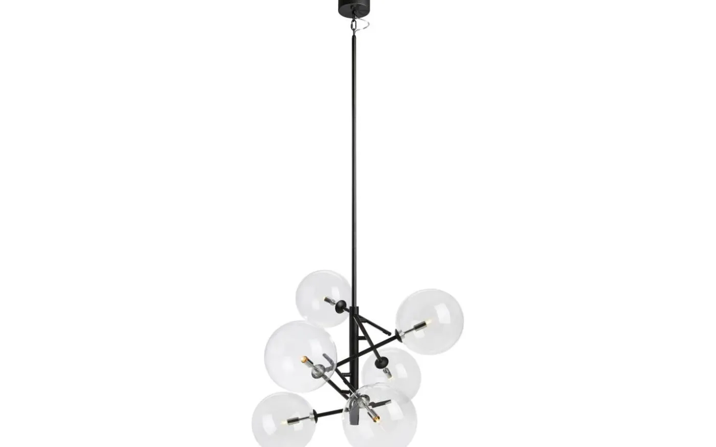 Vackra Andrew takpendel från Markslöjd, en iögonfallande taklampa i svart metall och sex glober i klart glas. Tidlös design som passar i de flesta hem. Lampan kan enkelt förkortas till önskad höjd och hänges enkelt på takkrok. Du justerar själv enkelt de ställbara armarna, samt justerar höjden på taklampan med hjälp av fyra stycken avtagbara rör på 30 cm (max 1,2 m).