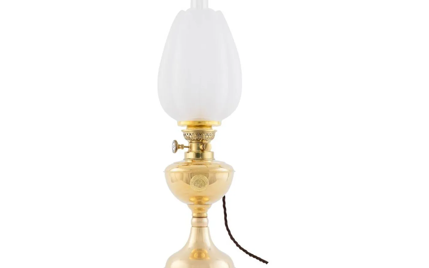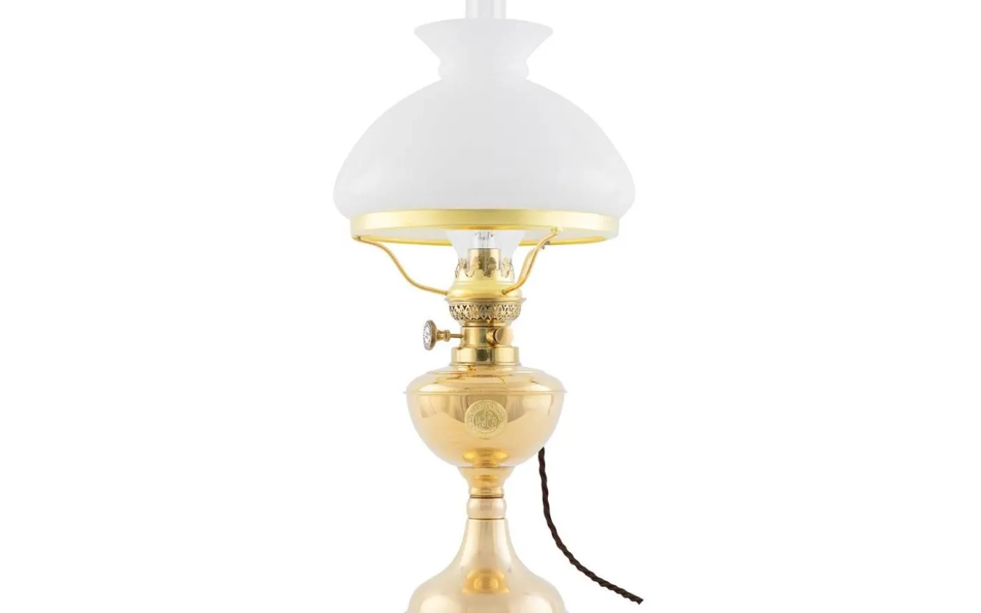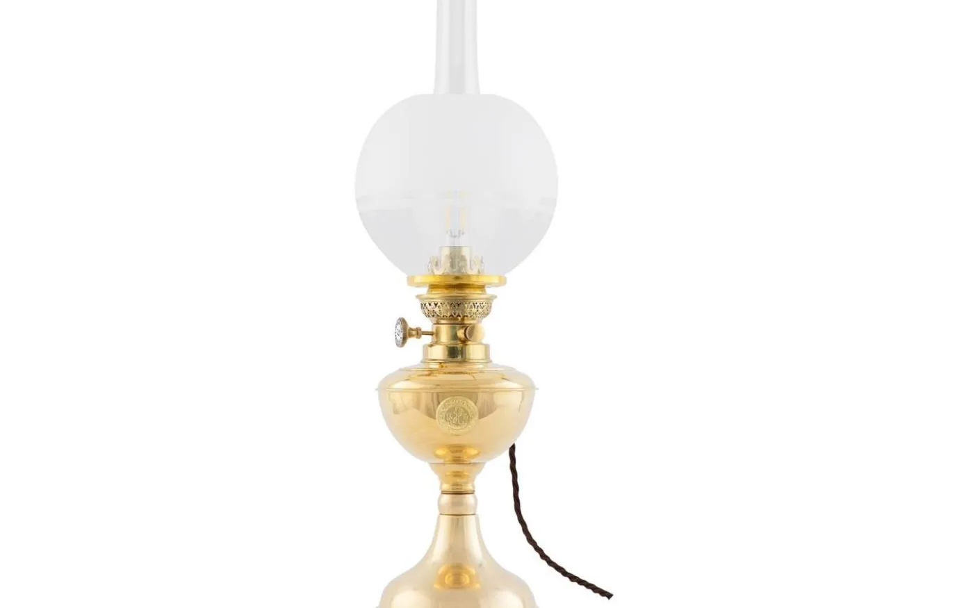 En klassisk elmonterad fotogenlampa med oljehus i mässing, som passar särskilt väl in i marina miljöer.