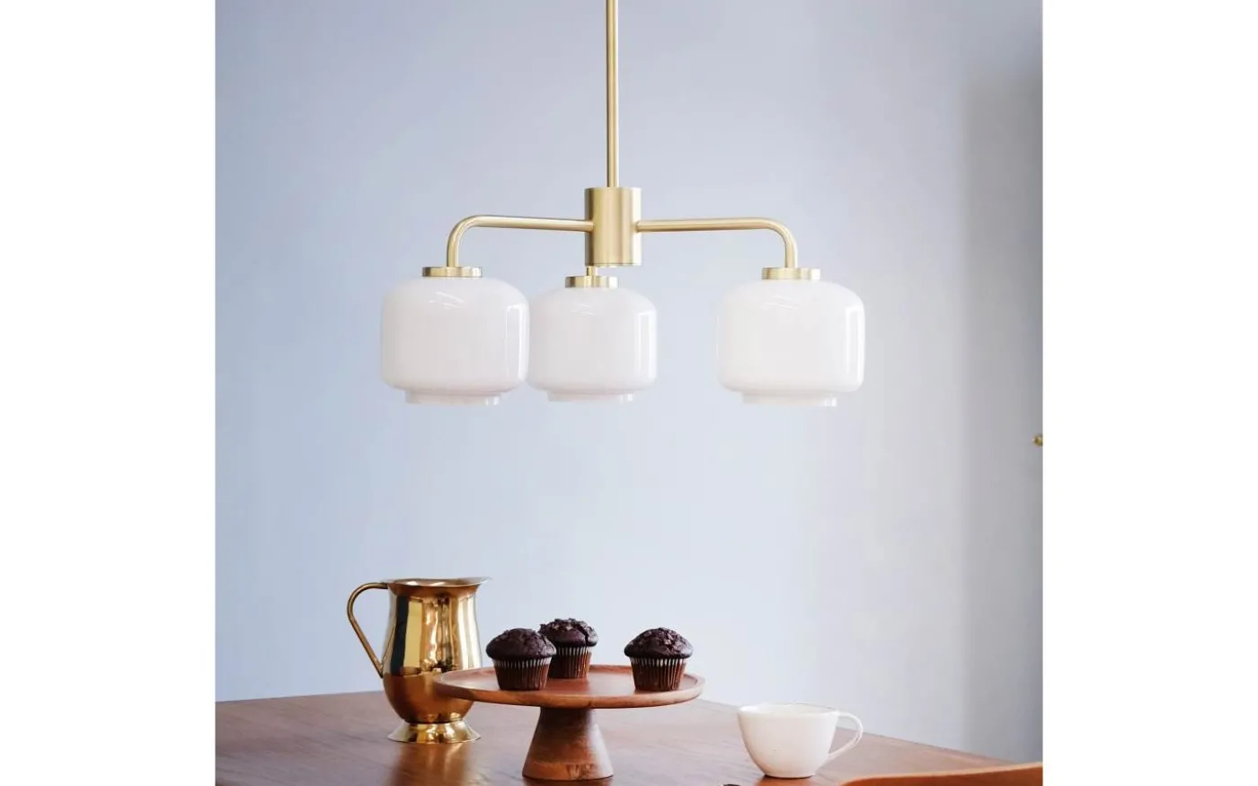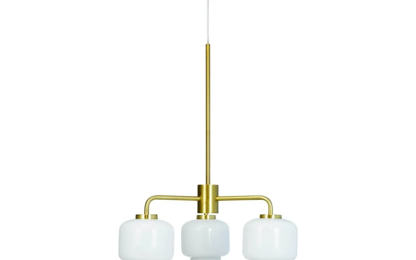 Klassisk och modern ljuskrona med 3 opalglas, med upphängning i matt mässing, vilket ger en snygg look till opalglaset.