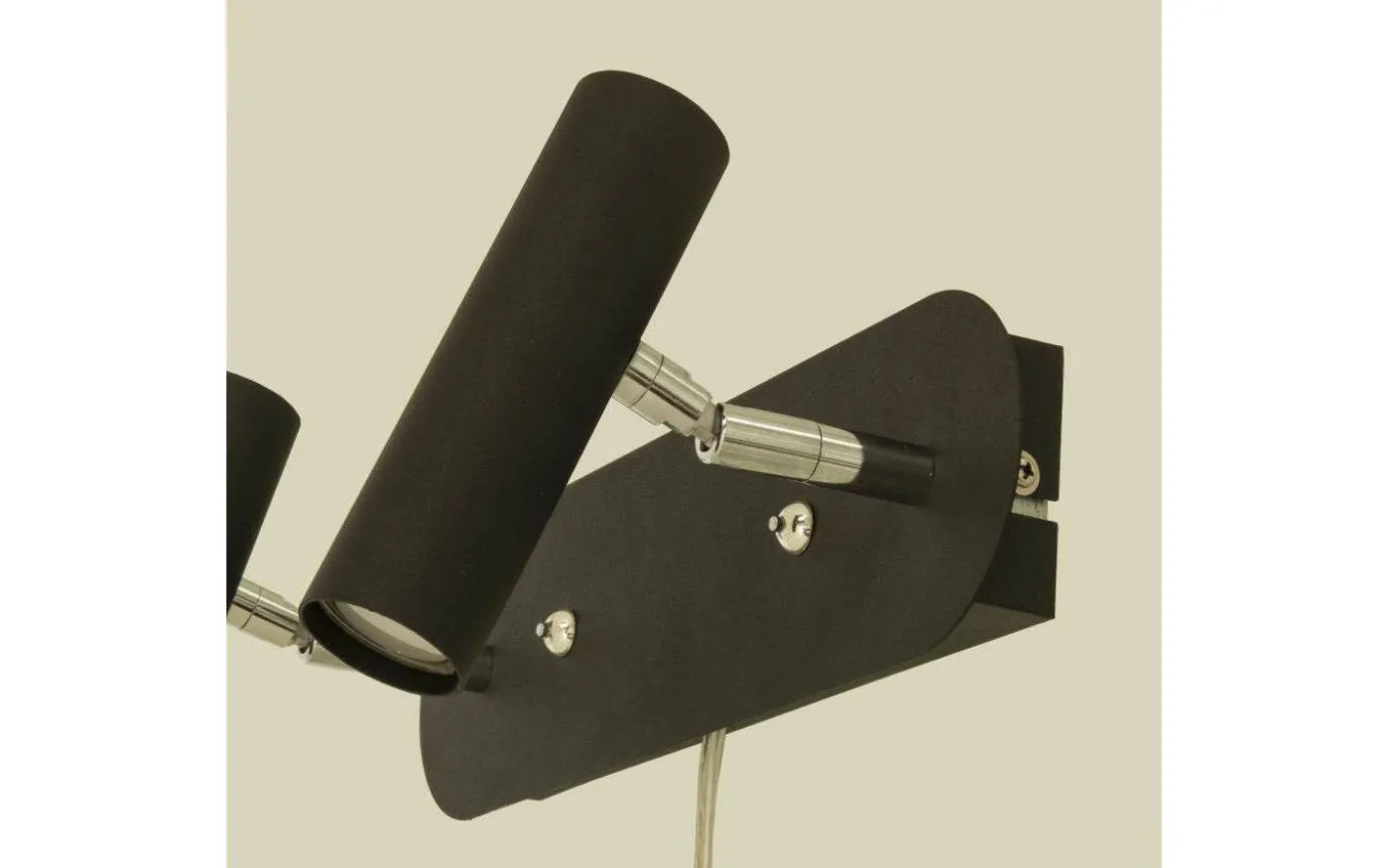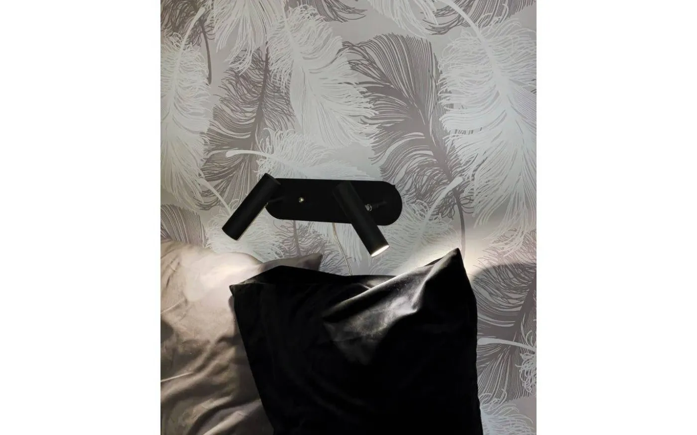Artic dubbel vägglampa i svartlackerad metall med detaljer i krom. 2 justerbara huvud med LED -ljuskälla som ger behagligt varmt vitt ljus. Kan dimmas separat. Lampan är monterad med bygel och sladden är 250 cm lång.