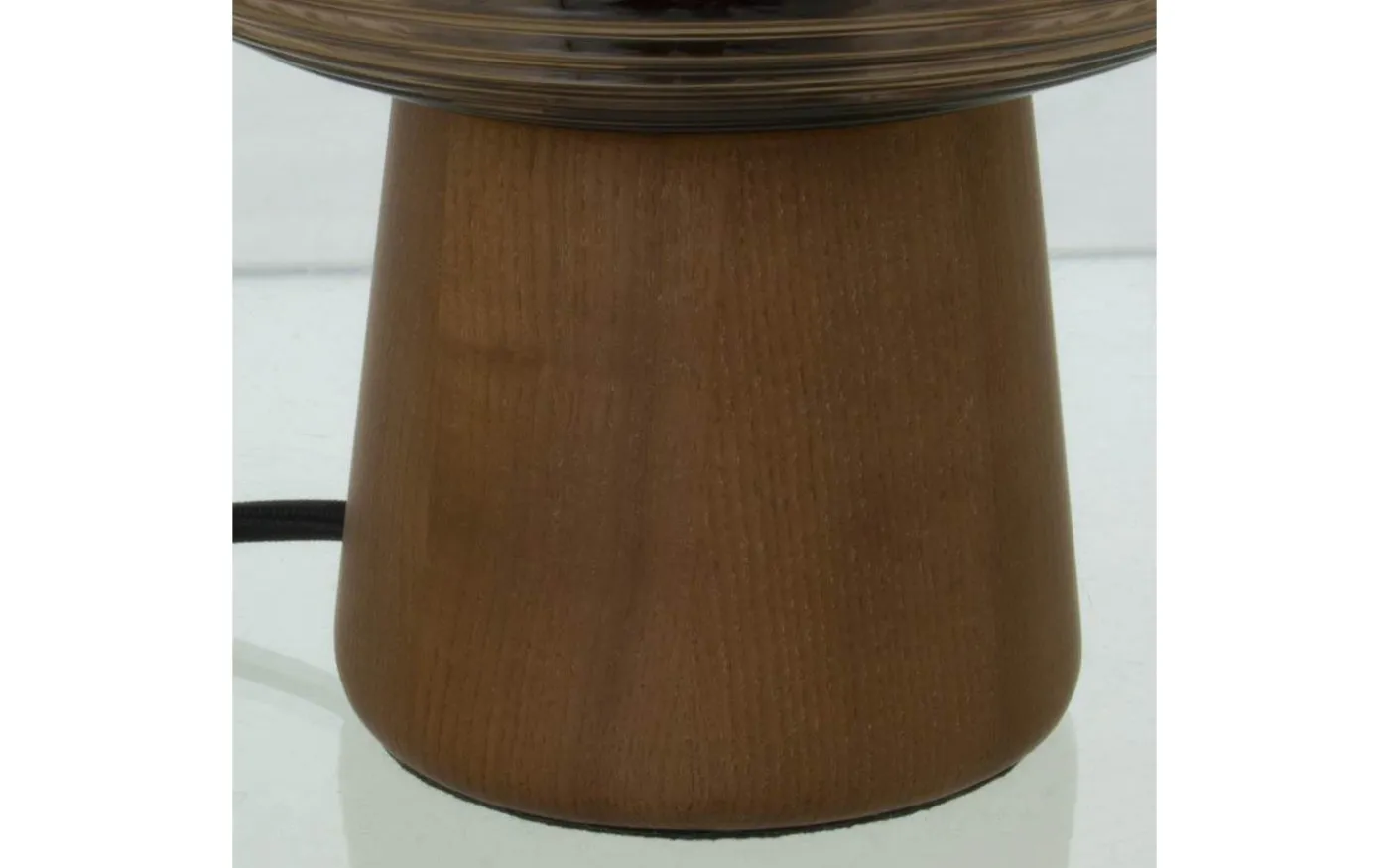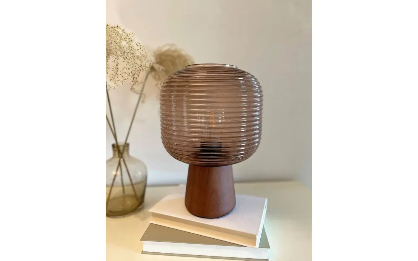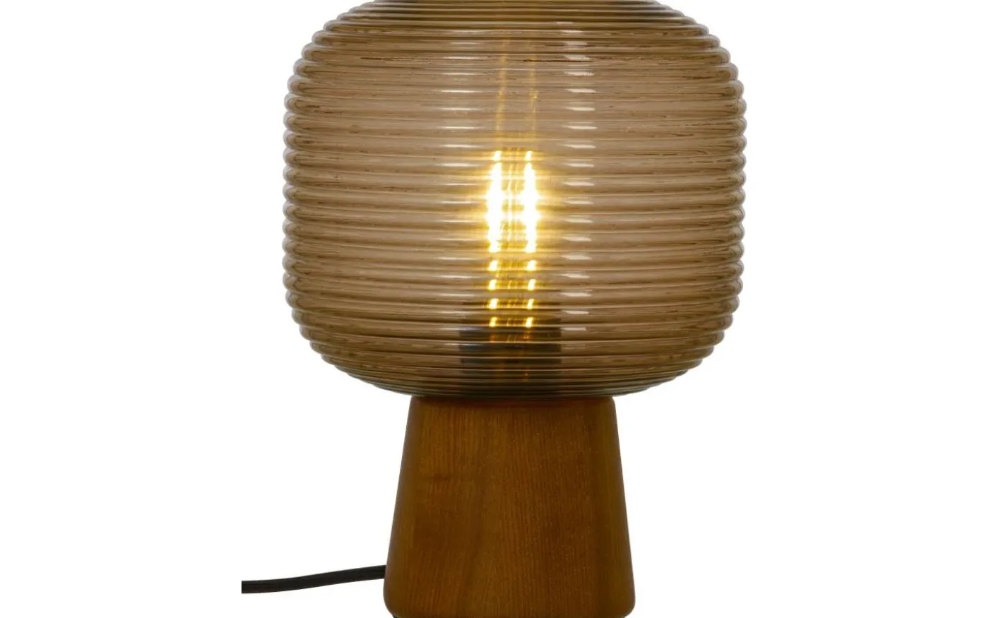 Aura är en lättplacerad bordslampa i en modern design med blockformad träfot och en räfflad skärm i brunt glas. Räfflorna på skärmen dämpar ljuset och skapar en mysig atmosfär i ditt hem.