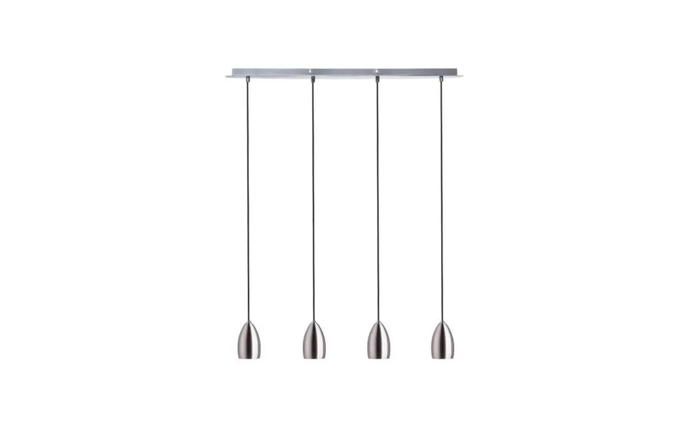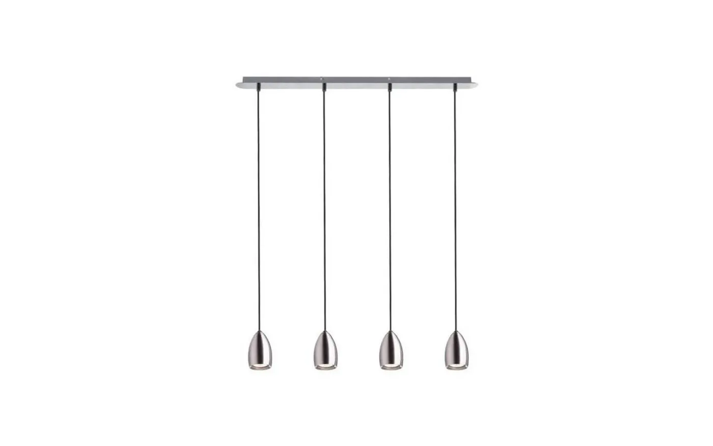 En sofistikerad taklampa som består av fyra pendlar med skärm och takkåpa i färgen matt nickel.