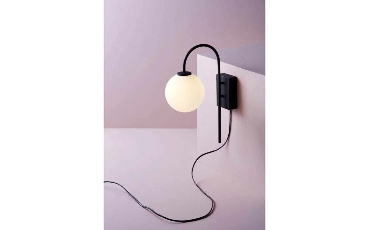 Vackra Ballon vägglampa, från danska Herstal, är en stilren vägglampa med stomme i svart metall och kupa i opalvitt glas. Den böljande armen blir en mjuk och fin kontrast till de hårda materialvalen och Ballon vägglampa passar lika bra intill sängen som i hallen.