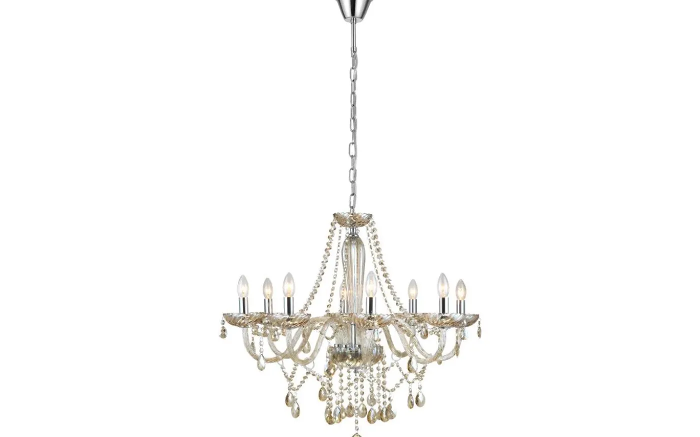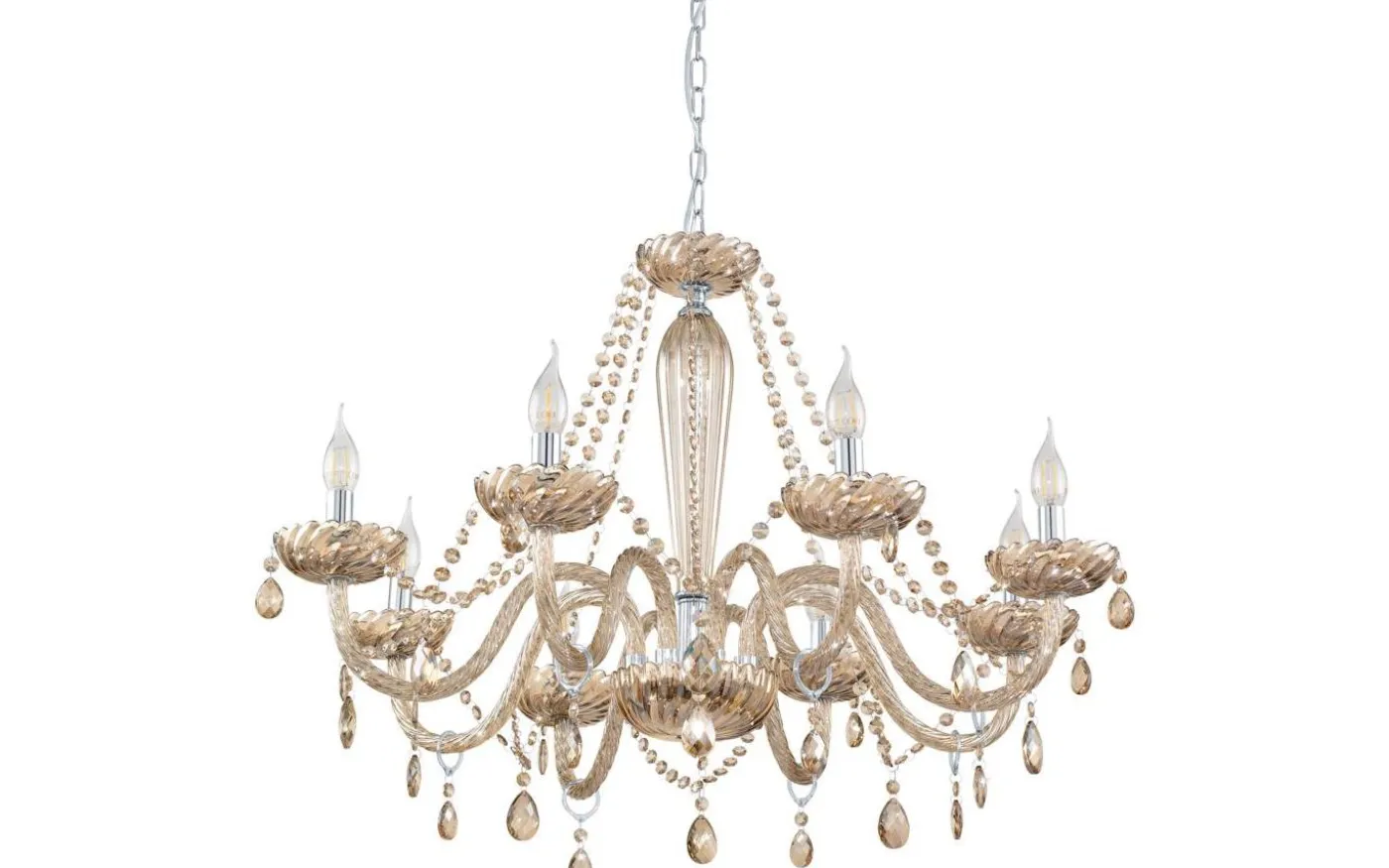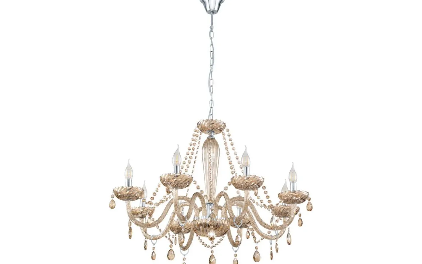 Denna pendelarmatur från serien BASILANO är gjord av förkromat stål och konjaksfärgat glas.
