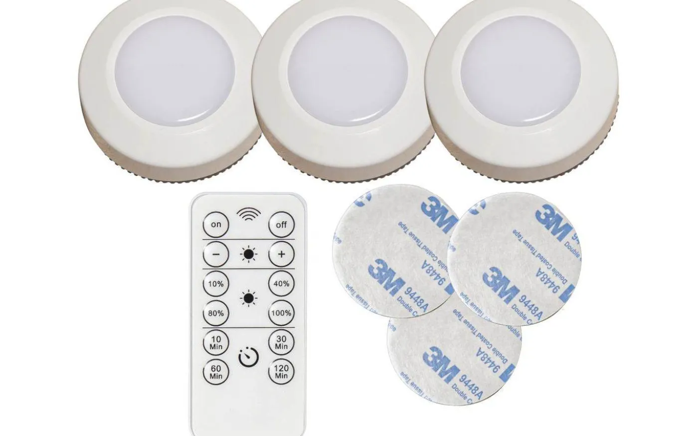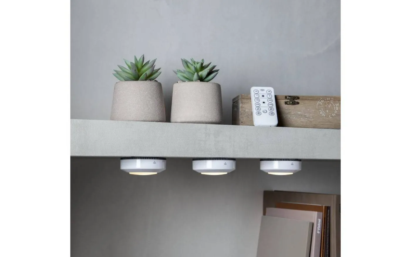 Dessa batteridrivna spotlights fästes enkelt med den självhäftande tejpen på spotlightens baksida. Med medföljande fjärrkontroll kan du enkelt ställa in timer, tända/släcka samt dimra ljusstyrkan efter önskemål.