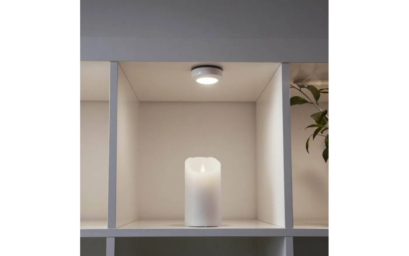 Dessa batteridrivna spotlights fästes enkelt med den självhäftande tejpen på spotlightens baksida. Du tänder och släcker lamporna enkelt genom att trycka på lampans ovansida.