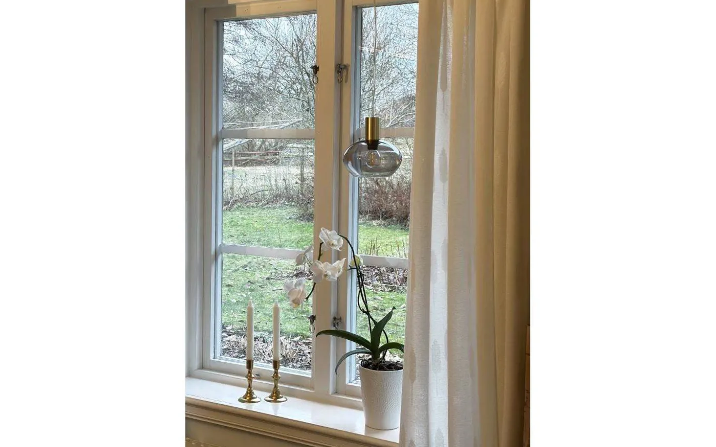 Bell fönsterlampa i matt mässing och rökfärgat glas. 4 meter sladd med mellanströmbrytare och stickpropp. Max 30W E14, ingår ej.