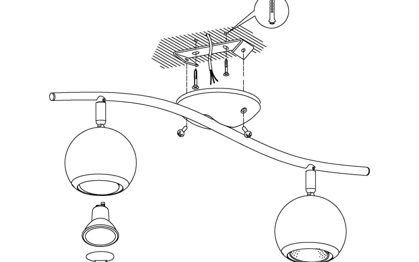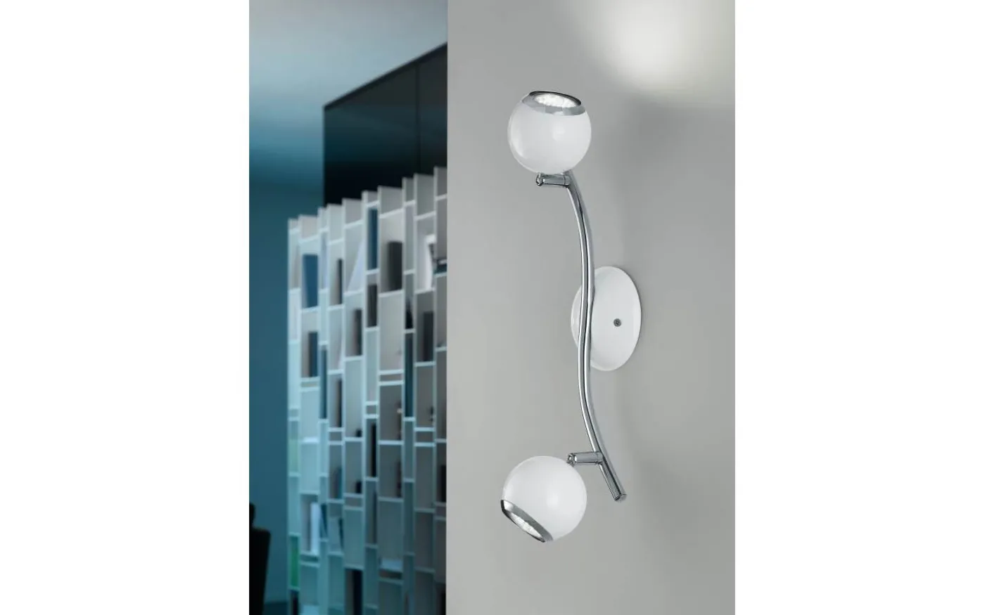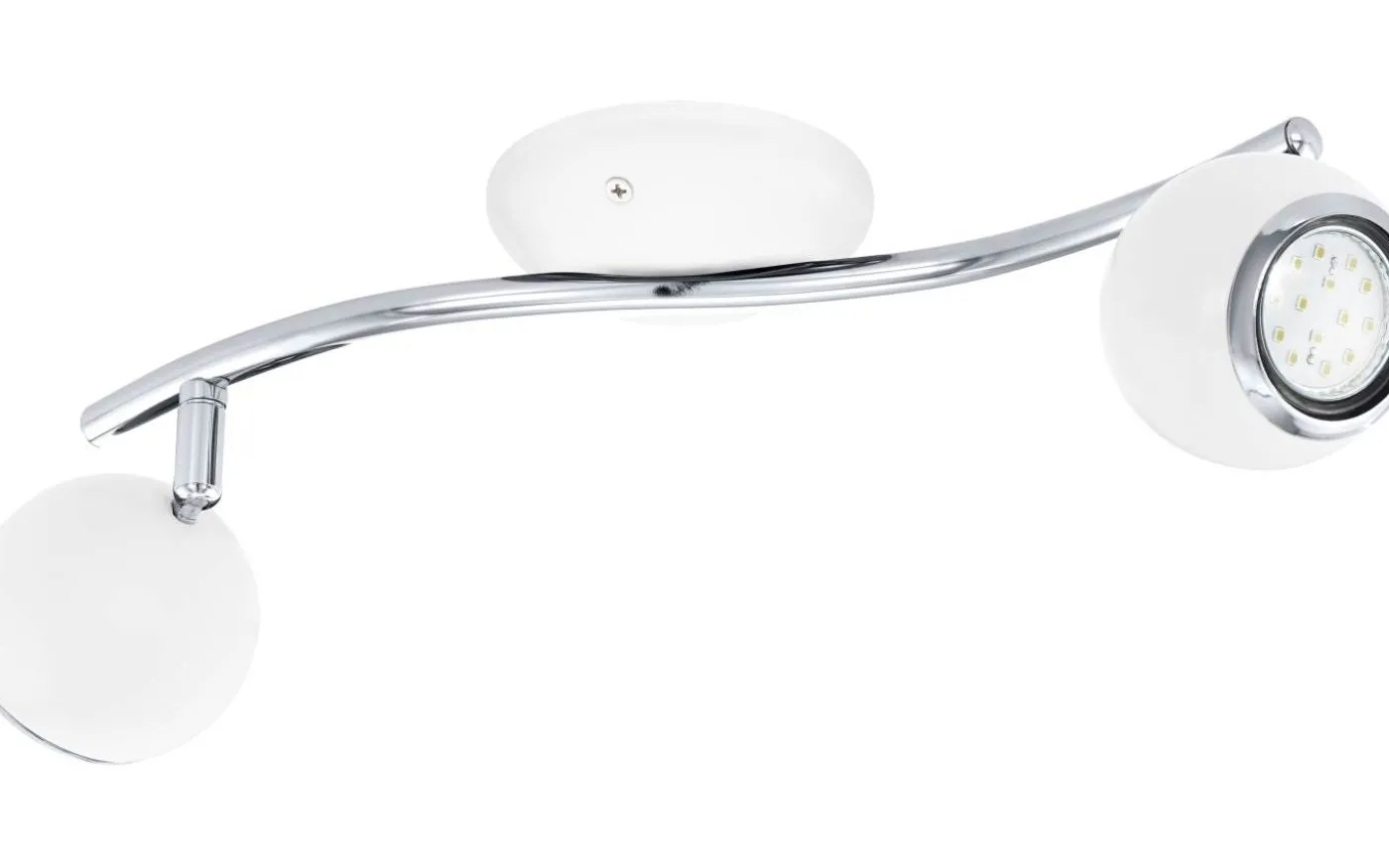BIMEDA LED-taklampan är tillverkad av metall i vitt med kromdetaljer. De två justerbara, sfäriska strålkastarna på den mjukt böjda armen ger ett behagligt varmvitt ljus tack vare de medföljande GU10-lamporna och ger fokuserad belysning i rummet. Takspotlighten har en modern design och smälter utmärkt med olika inredningsstilar, oavsett om det är i köket, vardagsrummet, sovrummet eller hallen.