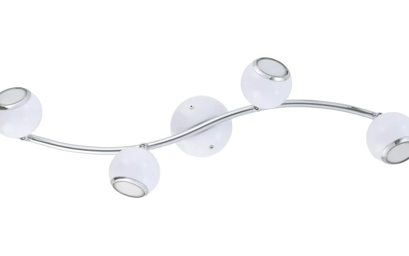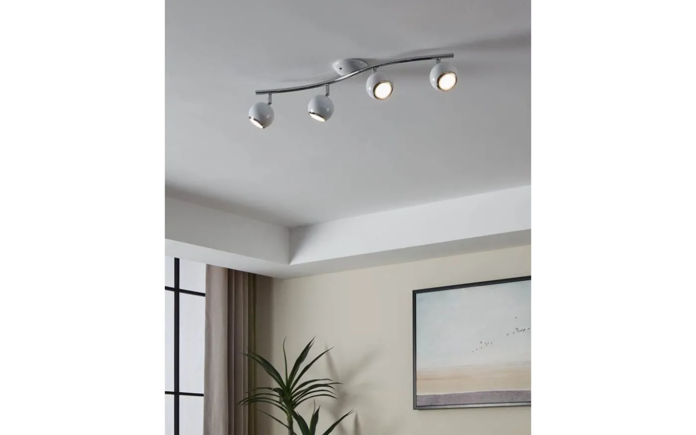 BIMEDA LED-taklampan är tillverkad av metall i vitt med kromdetaljer. De fyra justerbara, sfäriska strålkastarna på den mjukt böjda armen ger ett behagligt varmvitt ljus tack vare de medföljande GU10-lamporna och ger fokuserad belysning i rummet. Takspotlighten har en modern design och smälter utmärkt med olika inredningsstilar, oavsett om det är i köket, vardagsrummet, sovrummet eller hallen.