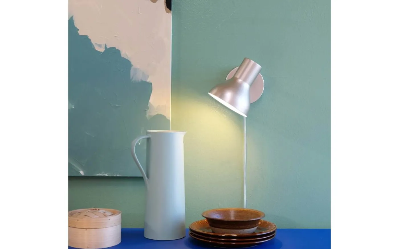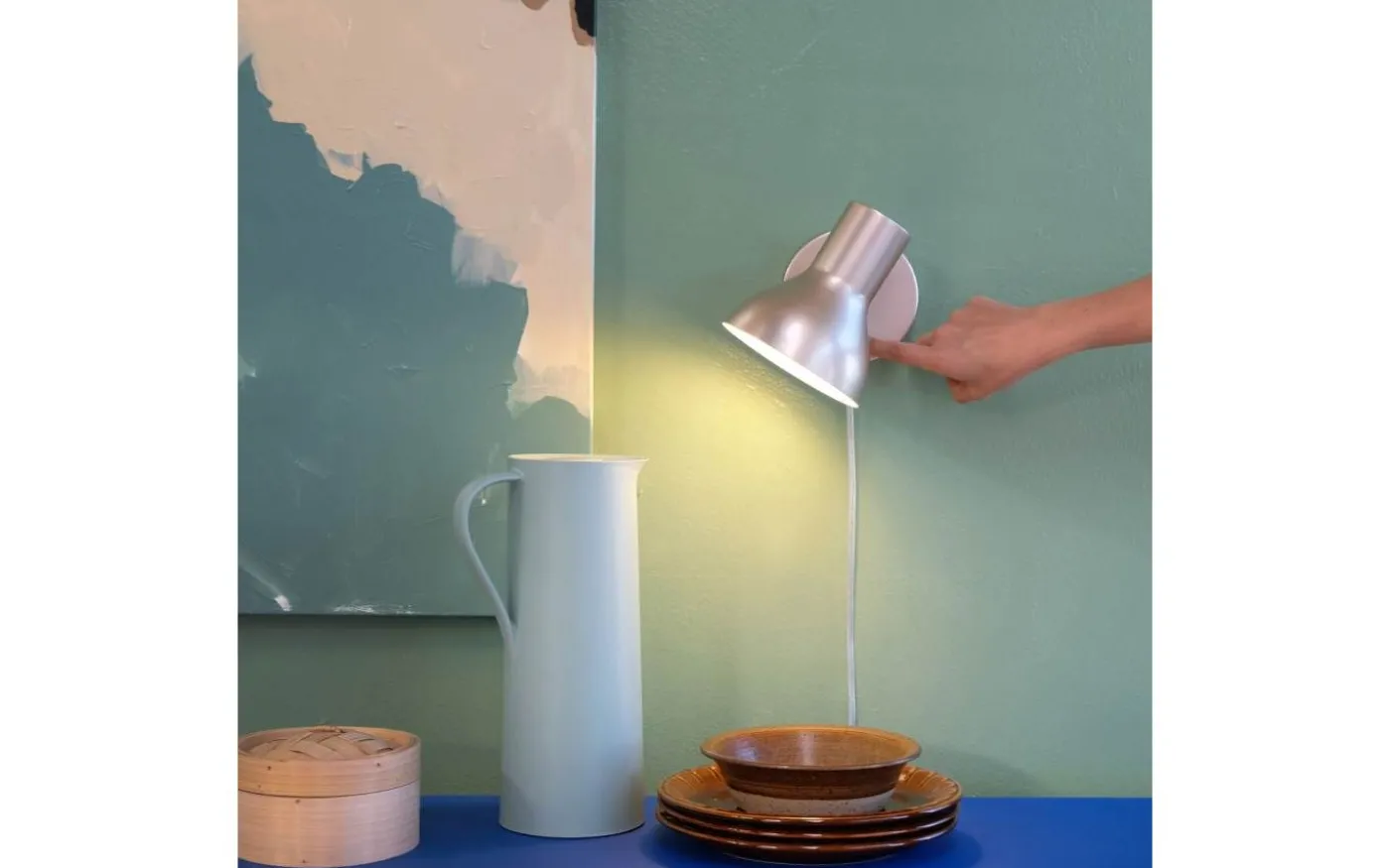 Vägglampa med on/off sidor på väggfot. Metallisk färg. Skärmen kan rotera och luta.