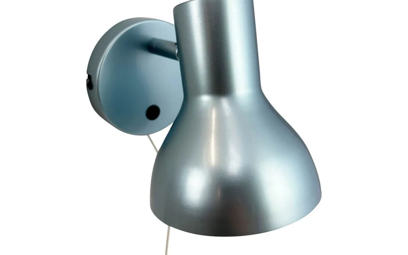 Vägglampa med on/off sidor på väggfot. Metallisk färg. Skärmen kan rotera och luta.