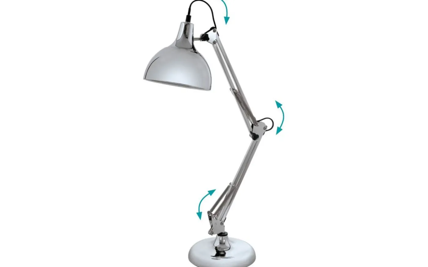 Bordslampan BORGILLIO är tillverkad av kromfärgad metall med en justerbar, kromfärgad skärm. De praktiska lederna på kroppen gör att höjden kan justeras så att du kan belysa ett specifikt område i rummet på nolltid. Lampan kan enkelt tändas och släckas med sladdströmbrytaren. Bordslampan smälter sömlöst in i moderna interiörer.