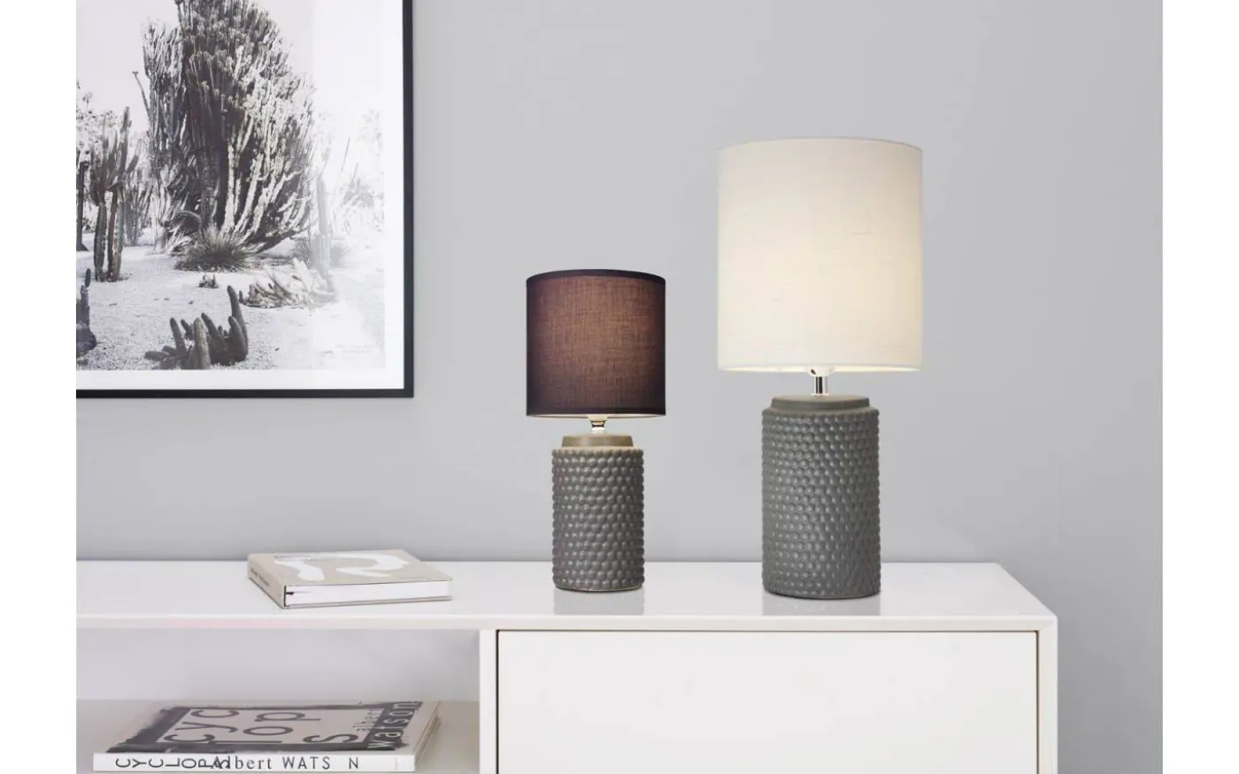 Fina bordslampan Bubble XL, från Cottex, har fot i keramik med en fin grå finish och cylinderformad vit textilskärm. Fotens bubbliga struktur ger inte bara lampans namn utan även en modern och iögonfallande design.