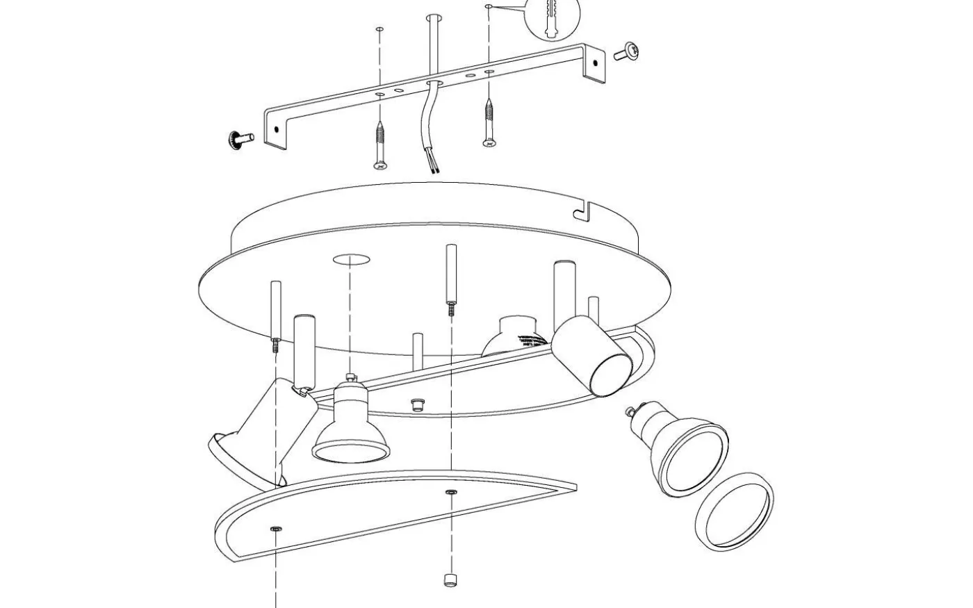 Denna takarmatur från serien CABO är gjord av förkromat stål och klart och vitt satinerat glas. Den är utrustad med fyra GU10-LED-lampor för ett varmvitt ljus.