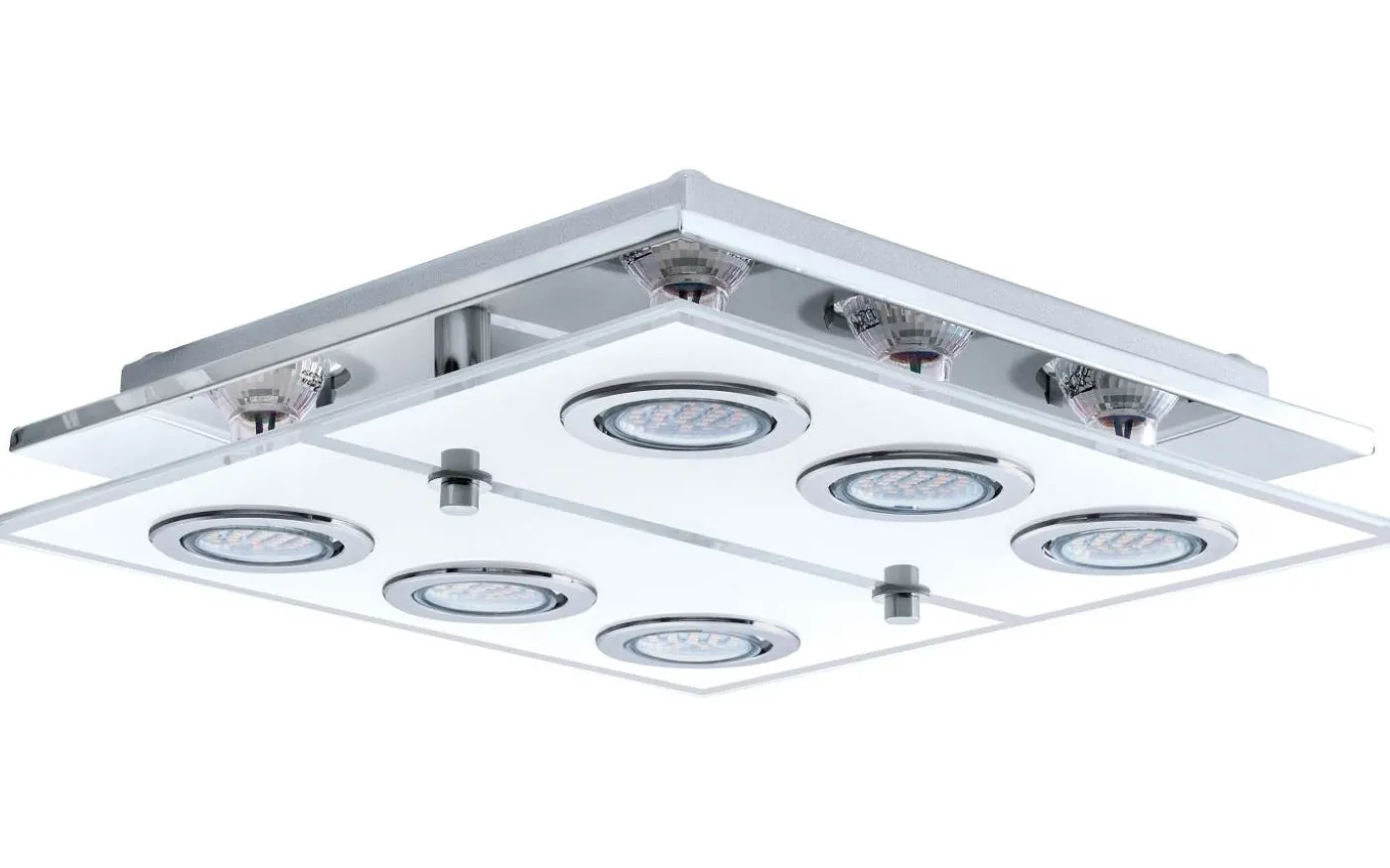 Denna takarmatur från serien CABO är gjord av förkromat rostfritt stål och klart och vitt satinerat glas. Den är utrustad med sex GU10-LED-lampor för ett varmvitt ljus.