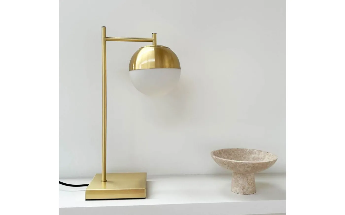 Caen bordslampa från Dyberg Larsen är tillverkad i borstad mässing och en vacker opalvit glaskupa som sprider ett behagligt ljussken.