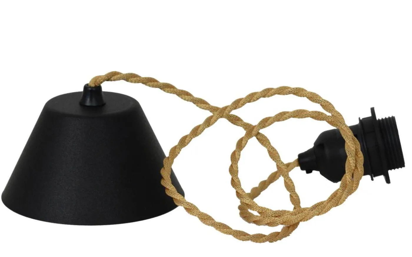 Takupphänget levereras med 1,5m twistad textilkabel i guld med svart takkopp och lamphållare med E27-sockel.