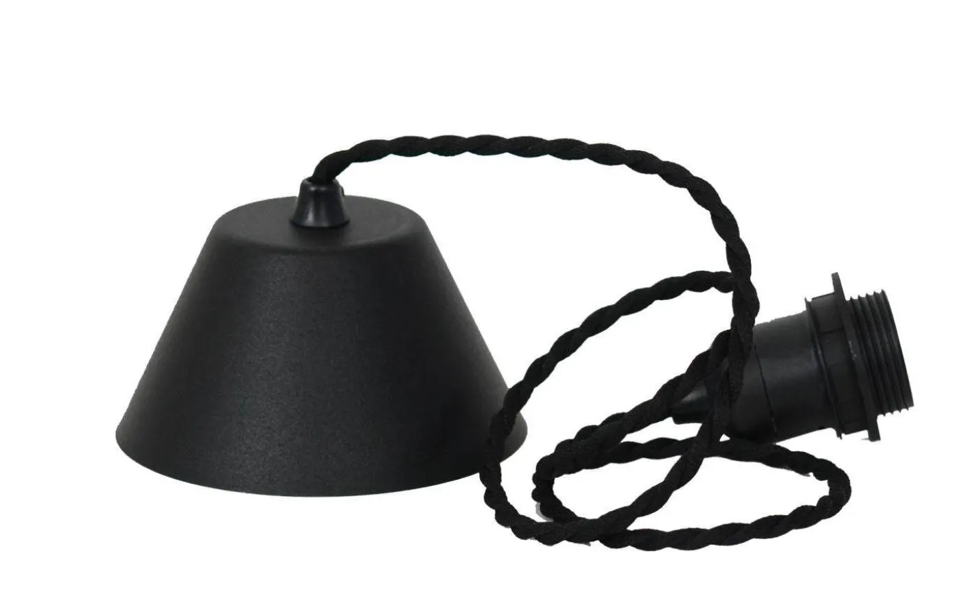 Takupphänget levereras med 1,5m twistad textilkabel i svart med svart takkopp och lamphållare med E27-sockel.