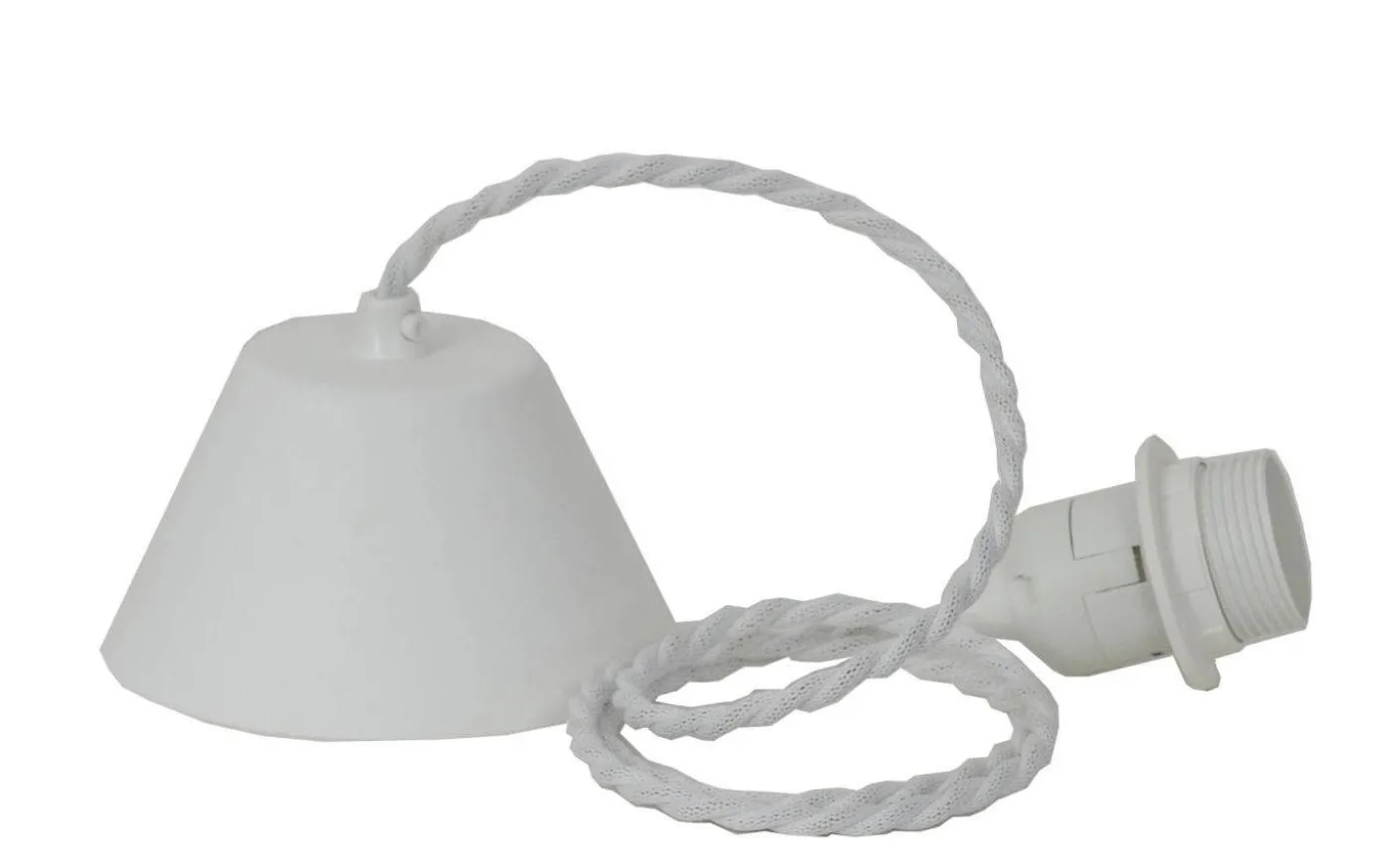 Takupphänget levereras med 1,5m twistad textilkabel i vit med vit takkopp och lamphållare med E27-sockel.