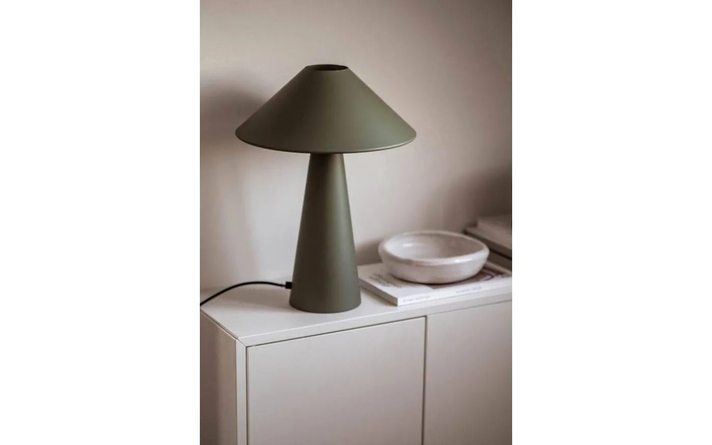 Stilrena bordslampan Cannes är designad av formgivaren Patrick Hall för välkända varumärket Globen Lighting. Både lampa och skärm är gjorda i metall och har en mattgrön finish som avger ett sobert och lyxigt intryck.