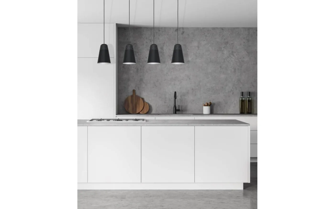 Canterras taklampa från välkända Eglo, är en stilfull taklampa med raka fina linjer i svart stål. Toppen på skärmarna är delad och den övre delen har ett fint spräckligt mönster i vitt och grått. Passar perfekt över matbordet eller köksön.