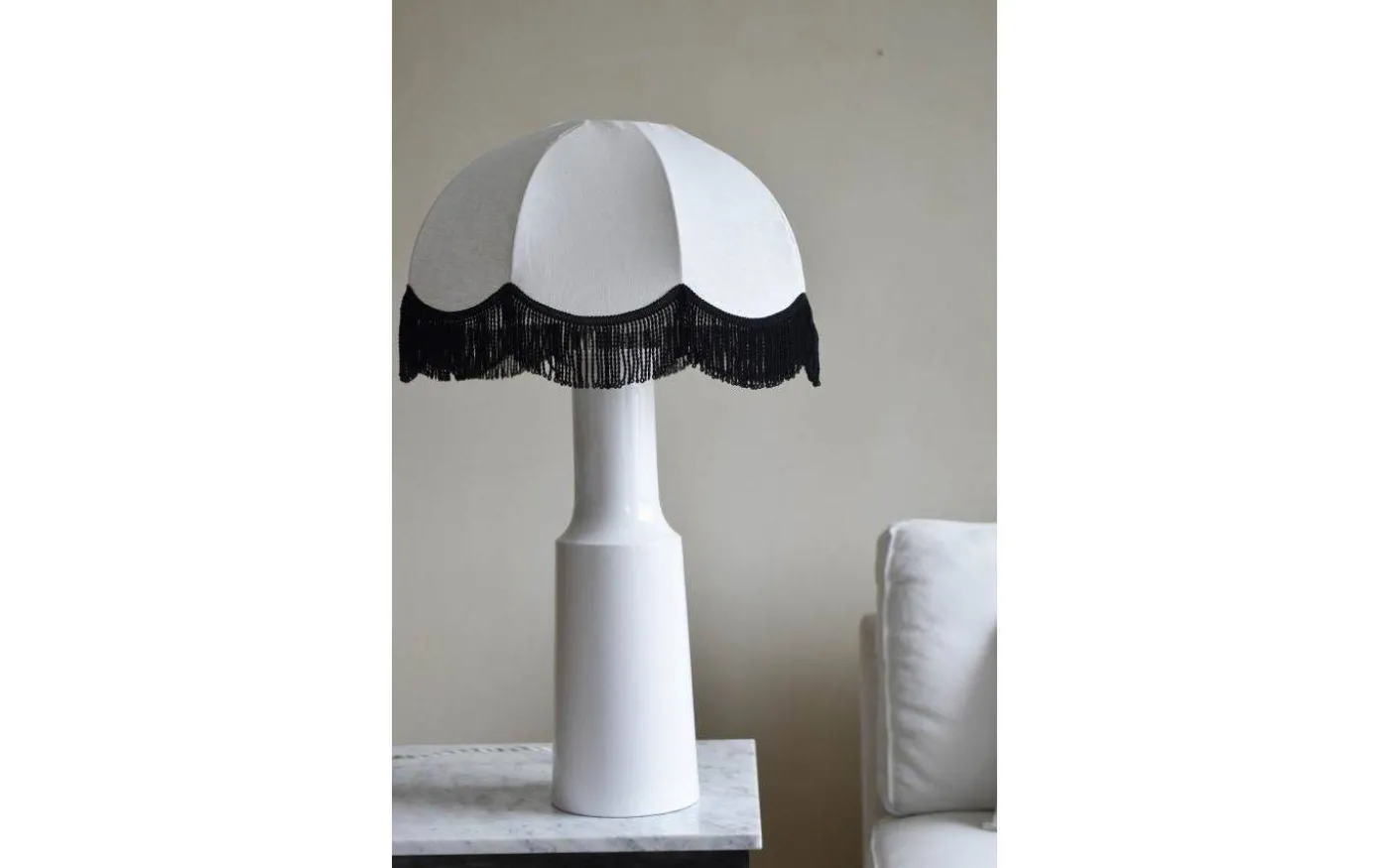 Carolin lampskärm från Hallbergs Belysning är en handsydd lampskärm av vitt linne tyg med en svart frans nertill.
