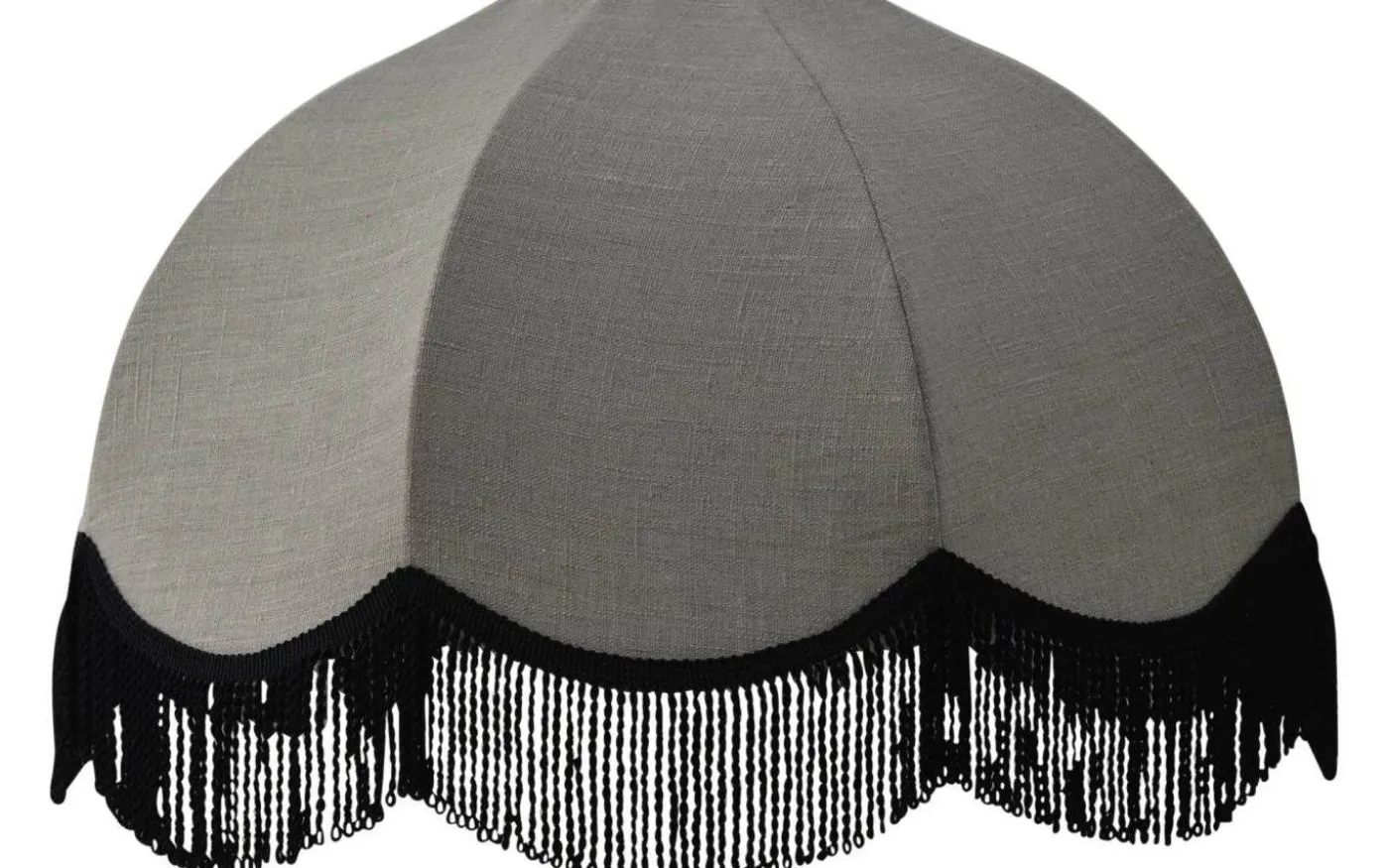 Carolin lampskärm från Hallbergs Belysning är en handsydd lampskärm av linne i färgen natur med en svart frans nertill.