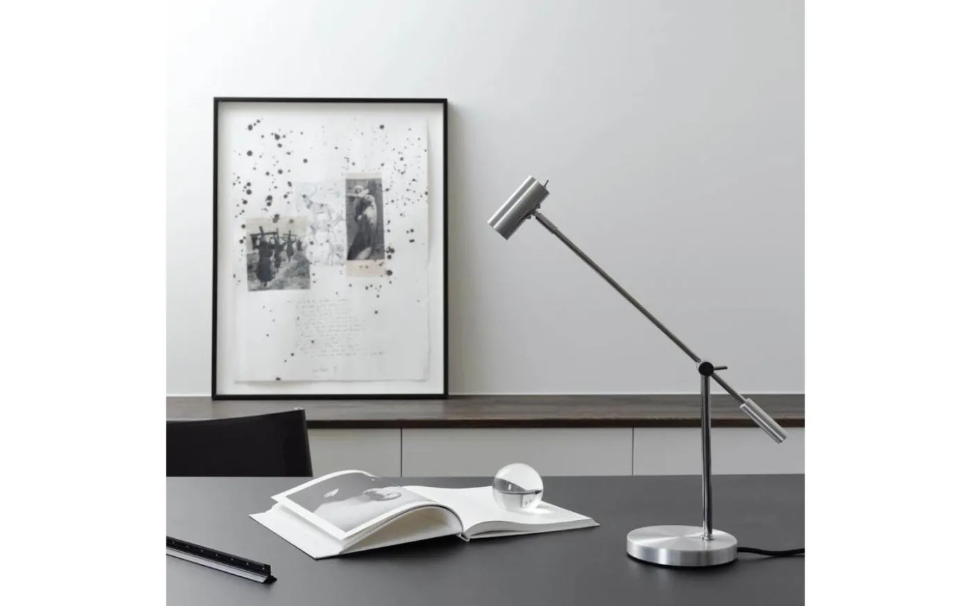 Skrivbordslampan är tillverkad av aluminium med en lätt slipad finish och detaljer i blank krom.