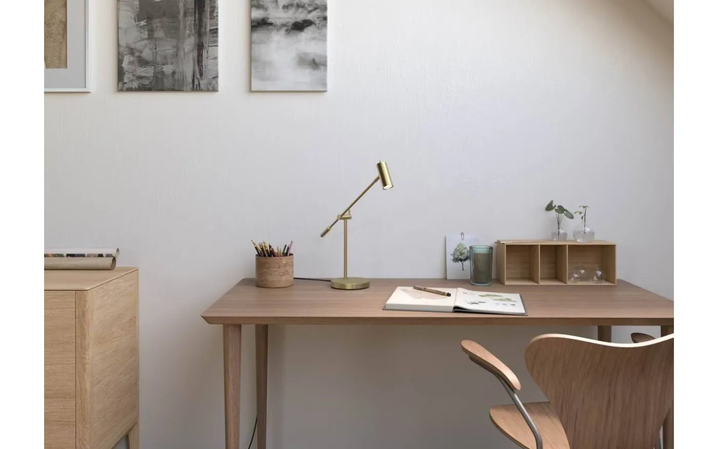 Skrivbordslampan är tillverkad av metall med en lätt slipad mässingsfinish.