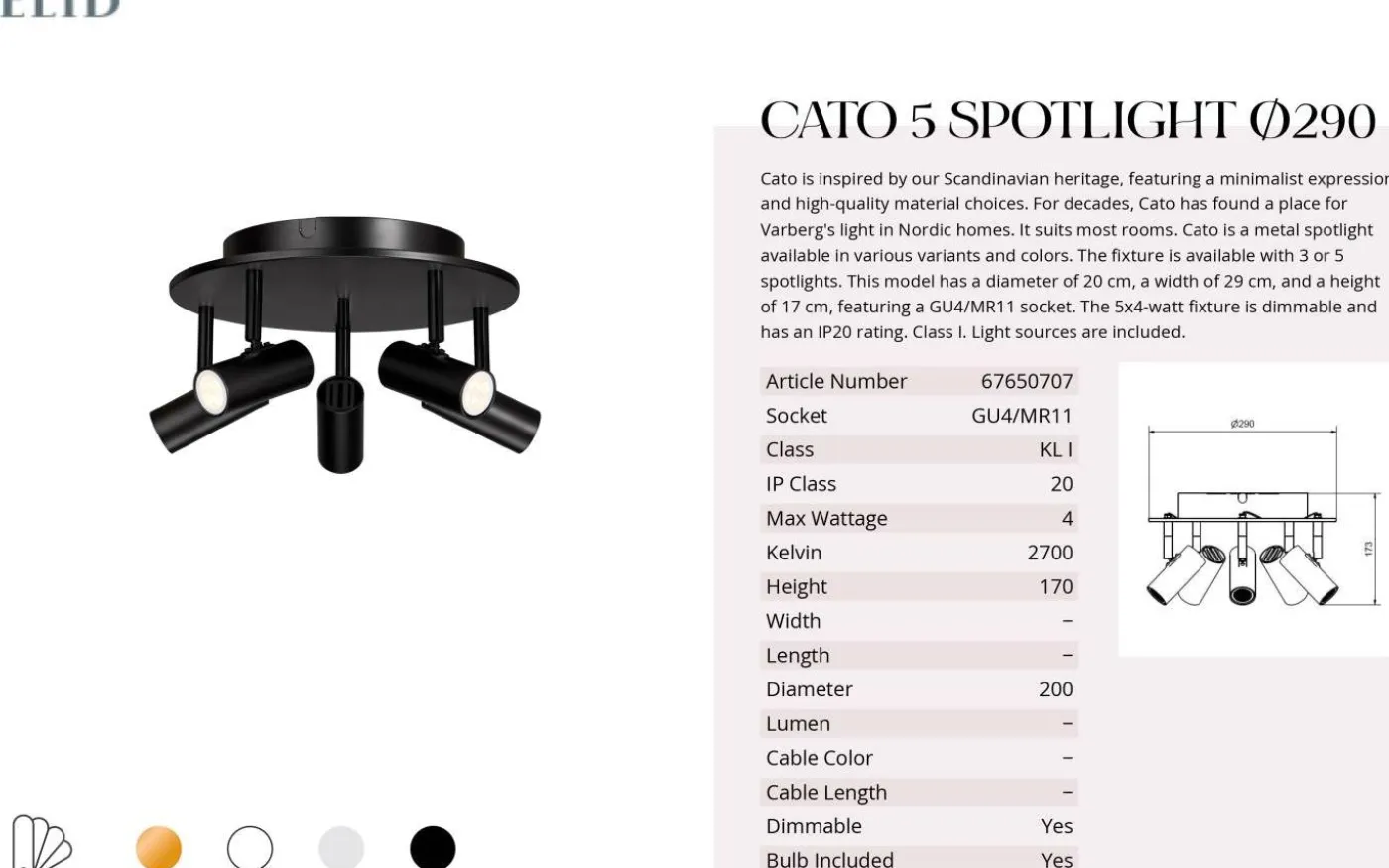Cato takspotlight passar perfekt i rum och utrymmen där du vill belysa flera olika delar av rummet samtidigt då du enkelt riktar de 5 lamphuvudena i önskad riktning. Taklampan är tillverkad av metall med en mattsvart finish.