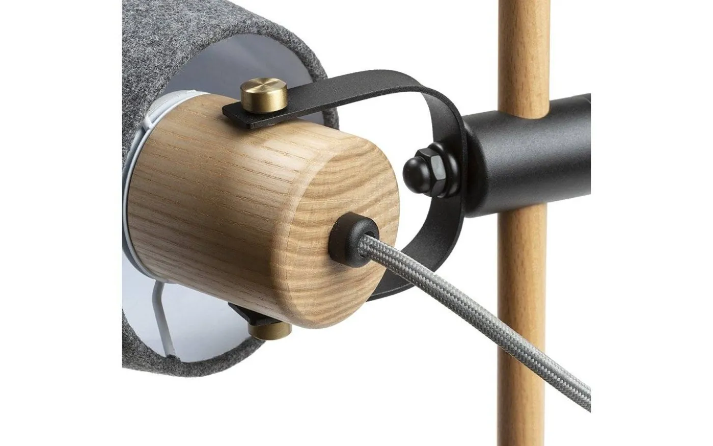 Choupette vägglampa i härlig kombination av trä, metall och grå textil. Lamphuvudet är flyttbart längs den 66cm långa trästången.