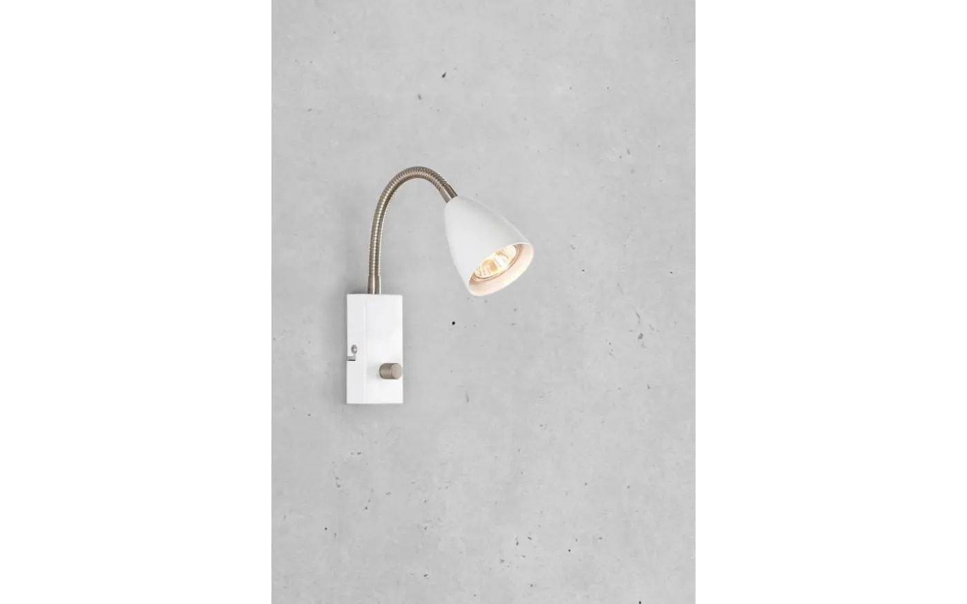 Vägglampan är av metall med en matt finish och har en flexarm i stål. Flexarmen gör att du enkelt kan vinkla och rikta ljuset efter eget önskemål och behov. Med dimmern på väggfästet reglerar du ljusstyrkan.