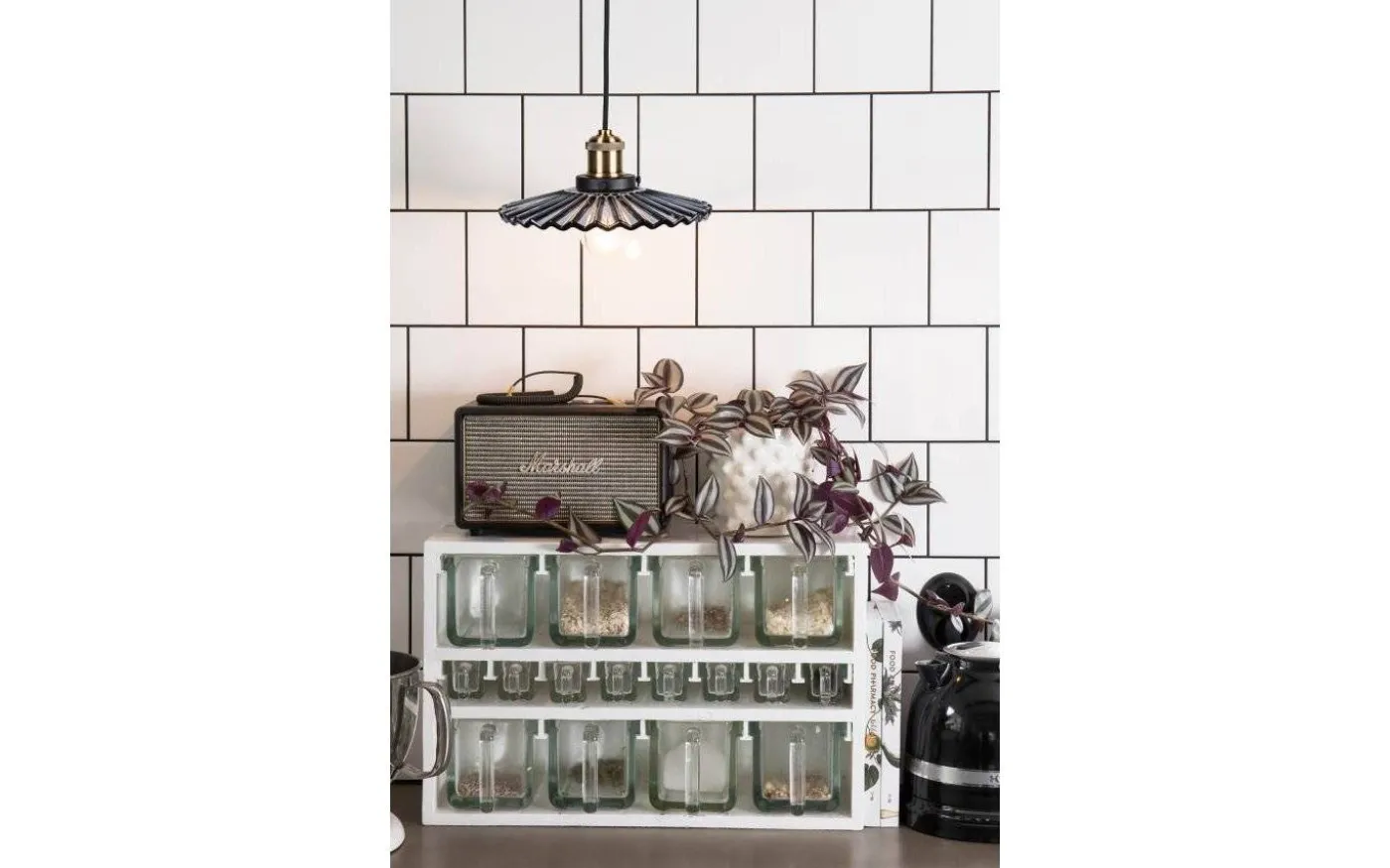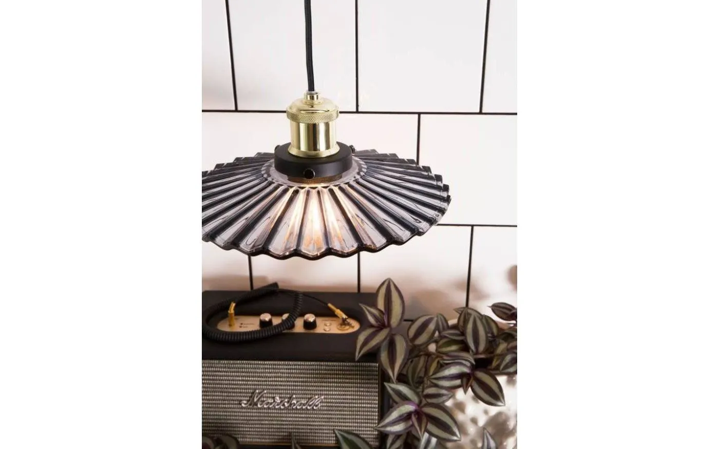 Cobbler från Globen Lighting är en modern variant av klassiska skomakarlampan med sin vågiga glasskärm, sockel i svart och antikmässing och en snygg svart textilkabel.