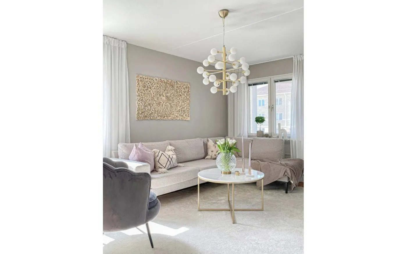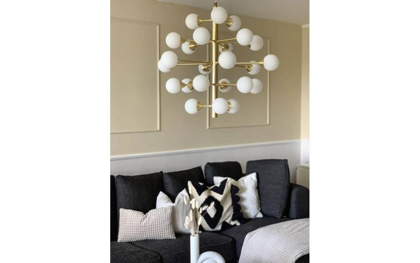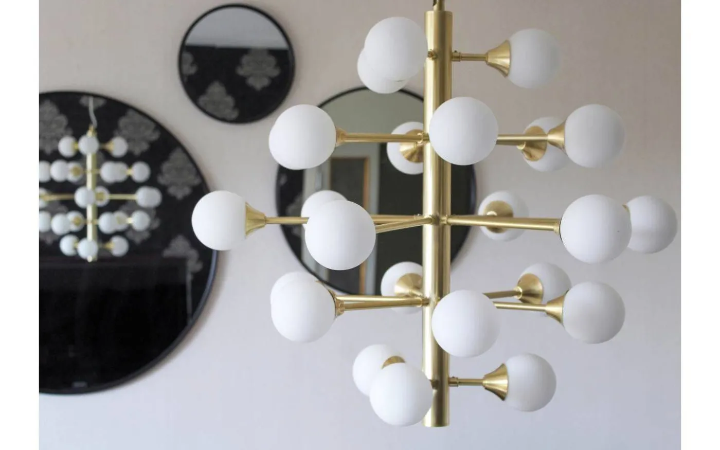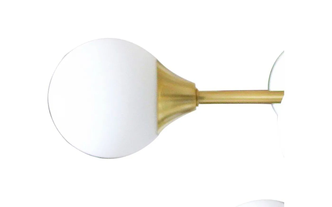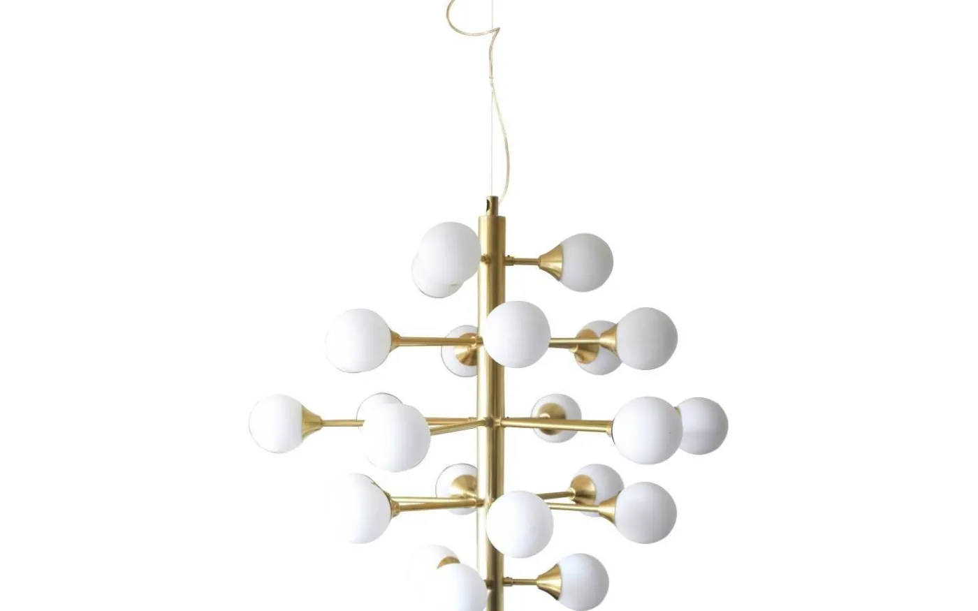 Cosmos taklampa i matt mässingsfärgad metall med 24 opalvita glaskupor. Takkopp i mässing för krokupphäng och kopplingsplint, lamppropp kan enkelt monteras. Max 24 x 25W G9, ingår ej. En modern lampa som passar såväl över matbordet som soffbordet.