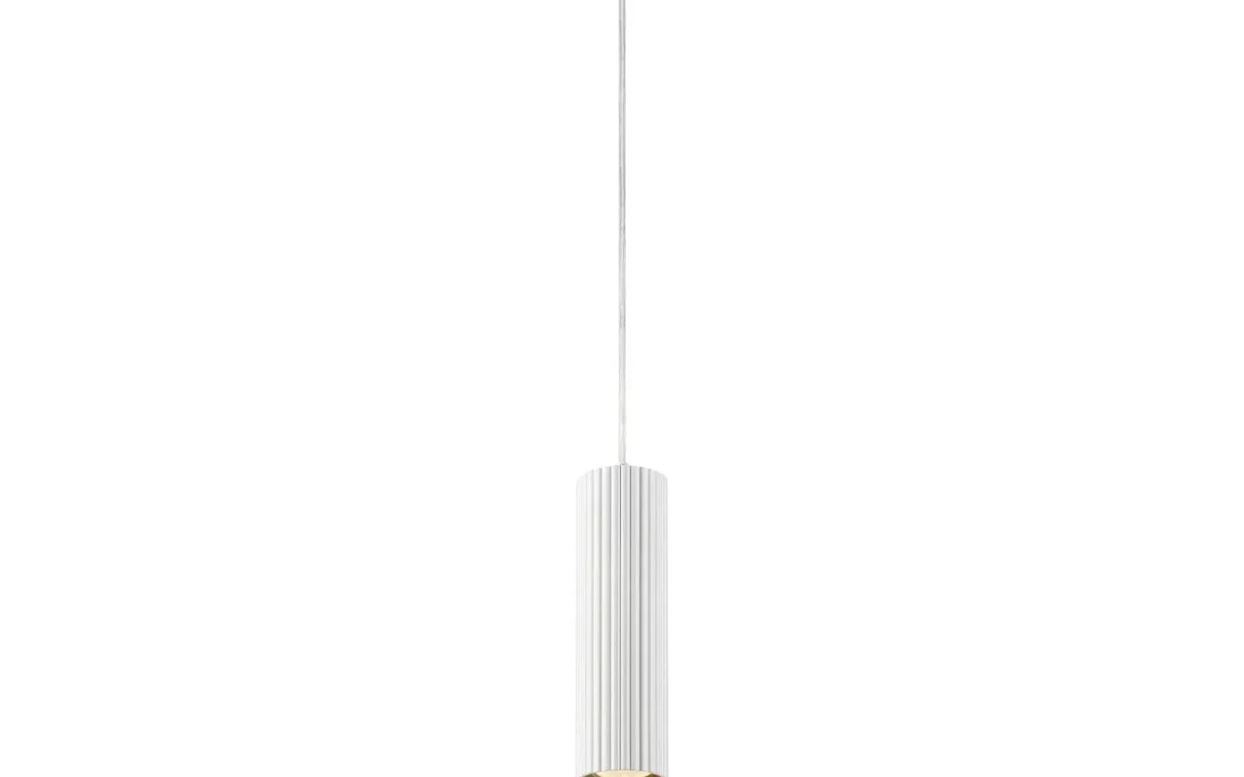 Takpendel i vit metall med en spotlight. Diskret räfflad skärm i metall som hänger i en transparent kabel. Taklampan ger ett behagligt stämningsljus och har en enkel design som passar de flesta hem. Finns även i mörkgrått och som serie med fler varianter.
