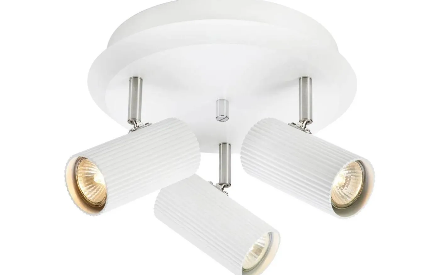 En takspotlight med 3 lampor i räfflad vit metall på en cylinderfattning. Riktbara spotlights som gör det lätt att justera ljuset. Finns även i mörkgrått och som serie med fler varianter.