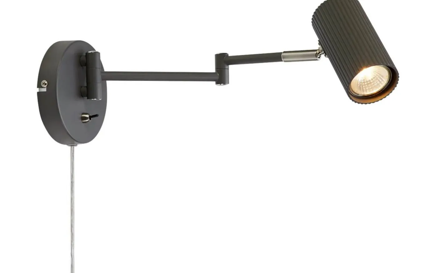 Vägglampa i mörkgrå metall med detaljer i borstat stål. Lamphuvudet är i räfflad vit metall. Inbyggd brytare på väggplattan och transparent strömkabel. Vridbart lamphuvud och spotlight med flexibel arm gör Costilla till en optimal läslampa. Finns även i vitt.