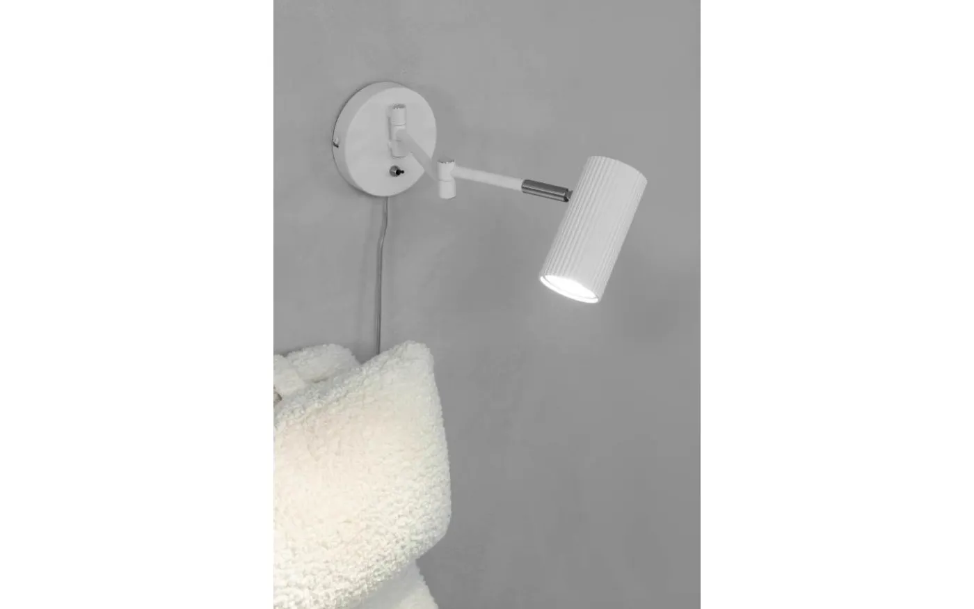 Vägglampa i vit metall med detaljer i borstat stål. Lamphuvudet är i räfflad vit metall. Inbyggd brytare på väggplattan och transparent strömkabel. Vridbart lamphuvud och spotlight med flexibel arm gör Costilla till en optimal läslampa. Finns även i mörkgrå.