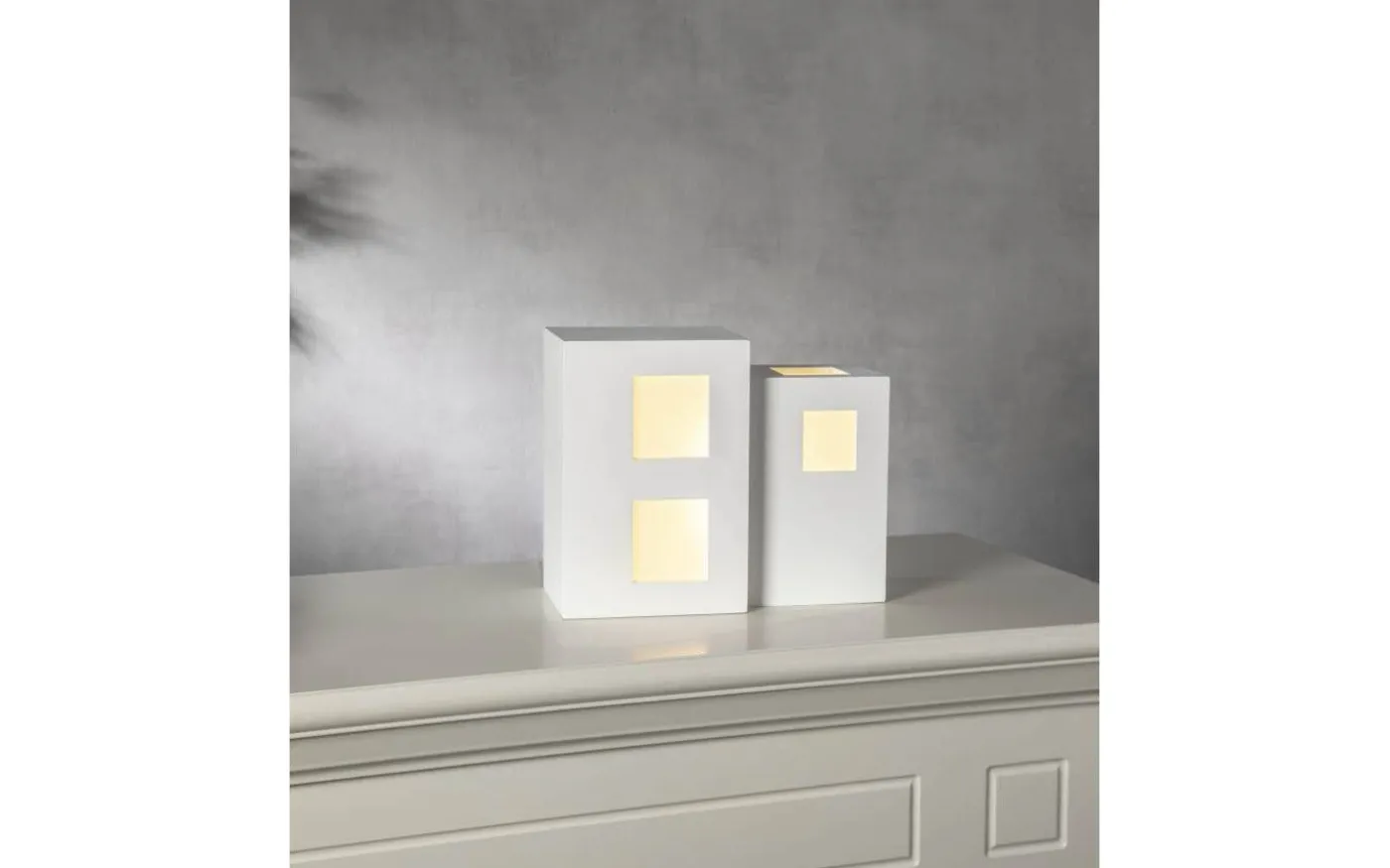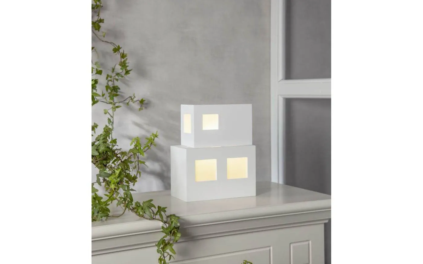 En fin dekoration i form av ett modernt hus som lyser med behagligt sken. Kan vändas åt två håll och på så sätt få olika utseende. En lampa som passar året om och är lättplacerad. Tillverkad i trä och målad i vitt.