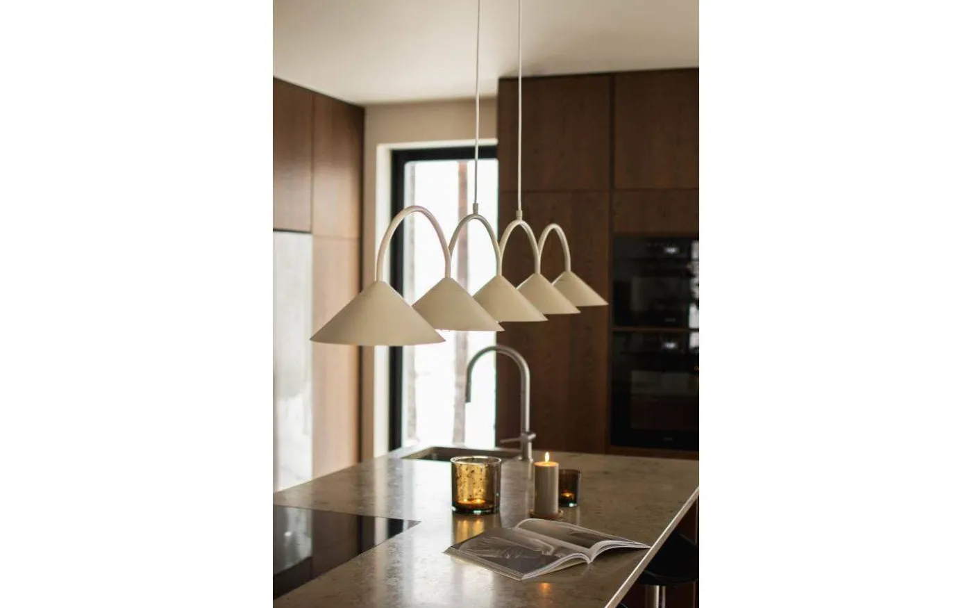 Curve taklampa från välkända Globen Lighting är designad av Patrik Hall är tillverkad av mattlackerad beige metall med fem stycken metallskärmar. Taklampan är ett resultatet av en lek med geometriska former där de mjuka rundade bågarna möter de skarpa triangulära linjerna på skärmarna.