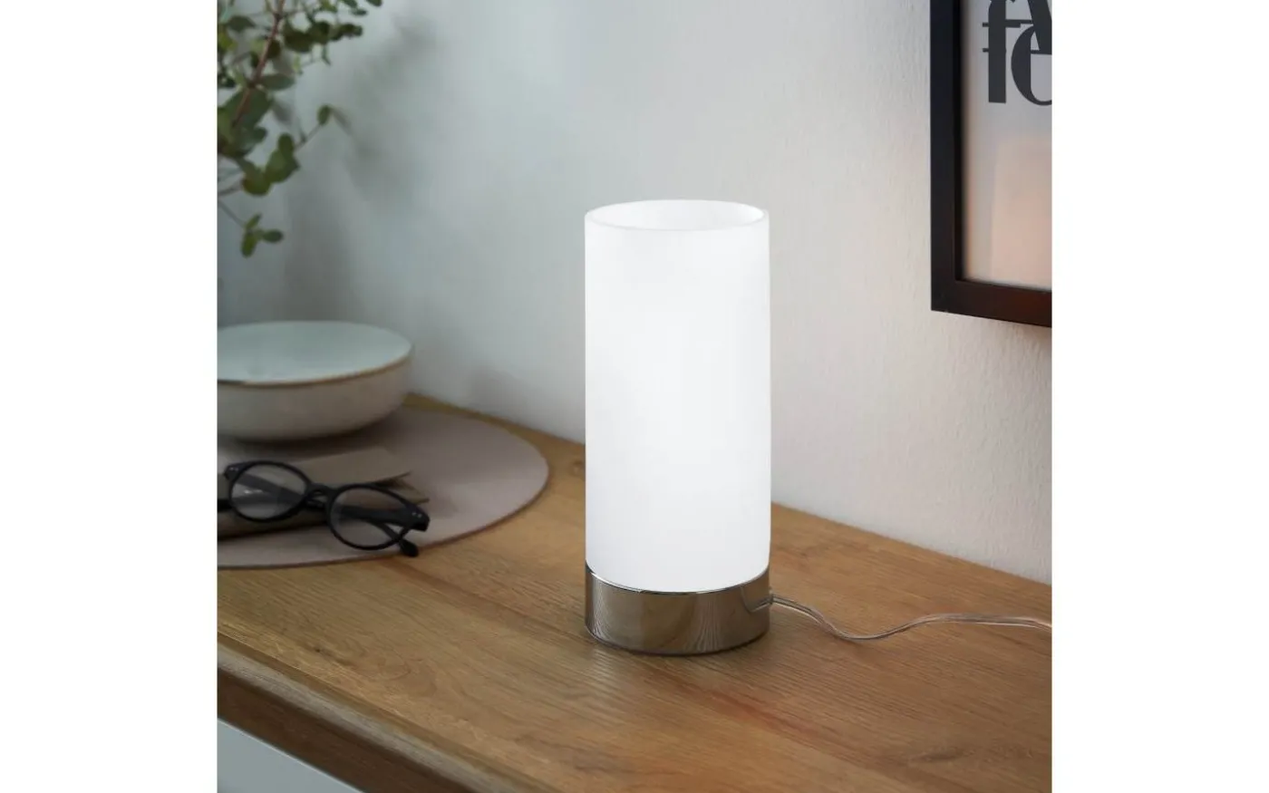 DAMASCO 1 bordslampa har en smal satinglascylinder i vitt och en kromfärgad metallfot. Bordslampan kan enkelt tändas och släckas med hjälp av sladdströmbrytaren och kompletterar med sin enkla design en minimalistisk interiör utmärkt. Oavsett om det står på ett nattduksbord eller i vardagsrummet eller hallen, ger den modern belysning för alla interiörer.