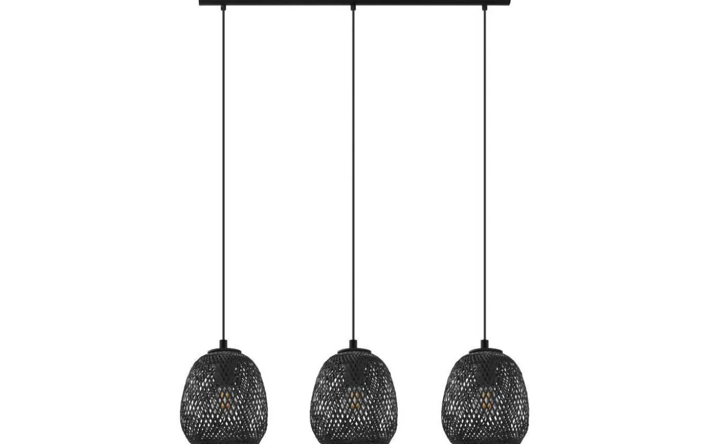 Dembleby taklampa från Eglo har en läcker kombination av stål och trä. Stålbasen har en svart finish och de tre nedpendlade lampskärmarna av svartmålat trä.
